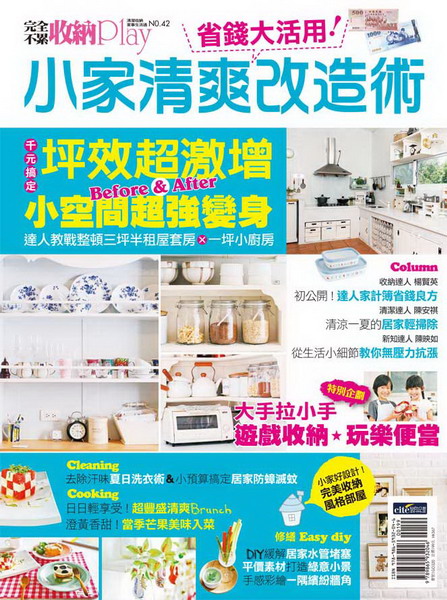 Column專欄 收納話題特蒐---日韓小商旅的聰明收納術 好用新品介紹---舒爽居家x優雅廚房好物30選 收納達人 楊賢英---初公開!達人家計簿省錢良方 清潔達人 陳安祺---清涼一夏的居家輕掃除 新知達人 陳映如---從生活小細節教你無壓力抗漲 Cover story封面故事 省錢大活用!小家清爽改造術 0元增量衣櫃空間x長效不亂衣物摺法 九宮格超效收整術x 改造紙箱百變收納 快速省力清潔法x 即刻清爽動線重整術 平價箱籃活用技 x 免錢瓶罐巧製收納盒 小家好設計!完美收納風格部屋 Case01寬敞白色調.日系美感小家 Case02 巧設計收整.美式輕鄉村小家 Case03 極簡省空間.北歐風小家 **親子同樂特企** 大手拉小手!兒童用品輕鬆收 大手拉小手!親子便當創意做 Cooking 料理小課堂 日日輕享瘦!超豐盛清爽Brunch 澄黃香甜!當季芒果美味入菜 Cleaning 省時省力清潔術 小預算搞定居家防蚊防蟲 去除惱人汗味的夏日洗衣術 修繕 Easy diy 超平價素材打造綠意小景 手感彩繪一隅繽紛牆角 DIY緩解居家水管堵塞