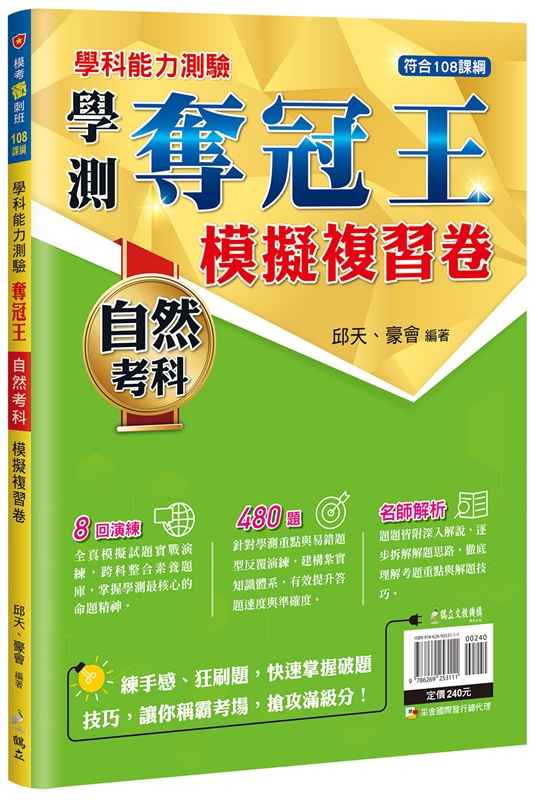 115年升大學分科測驗解題王:化學考科(108課綱) 【內容簡介】 一本在手,讓你Carry全場! 5大神對策,贏向滿級分! 鑑往知來 收錄近10年歷屆試題,重量級演練題庫! 逐題解析 解題思路與錦囊妙計,解題如神助! 考前衝刺 獨家考前10分鐘攻略,系統化必考觀念! 附解答本 分離式解答本,題解對照省時有效率! 超前部署 擬真模擬試題&答題卷,掌握趨勢最前線! 激活解題瞬思力╳強化大考應戰力! 【系列特色】 ◎近10年(105∼114年度)歷屆試題 分科測驗取代了原來的指考,由原本的十科縮減成八科,目的在檢視 同學是否具有大學校系所要求的學科的深廣能力。且在採計科目上, 各校系會從學測、分科測驗、術科考試中取3至5科作為採計科目,分 科測驗至少採計1科,想依循「考試分發」進入理想大學的話,分科 測驗的準備必然不能鬆懈。有鑑於此,本系列收錄近10年歷屆試題, 除了鑑往知來,還提供同學最充分的演練題庫,相信在經過10年份的 歷屆試題洗禮下,自身實力能更上一層。 ◎逐題詳細解析加注解題錦囊 延攬超強補教名師,以其多年豐富的教學經驗,逐題編寫詳盡的解 析,對於難度甚高的整合題型更有精闢的剖析。每題詳列課綱出處, 輔以解題錦囊,讓同學們能掌握定理及解題關鍵,進而加深學習印 象。解題思路則針對解題撇步與超強公式,作出全面性的整理,即便 在家自學也能清楚解題脈絡。 ◎選擇題之選項對錯標示清楚 坊間對於多選題題解,僅將各個選項的解答概略寫出,並未標明是非 對錯,同學常常得翻回題目頁面,才能逐一對照檢視各選項敘述,有 鑒於此,鶴立解題王不僅解析詳細,還將各選項逐一分析,讓同學不 僅知其然,更知其所以然。 ◎模擬試題挑戰實力(★附擬真答題卷) 鶴立作者群根據108課綱與最新考情精編1回模擬試題,讓同學做完歷 屆考古題之外,還能藉由模擬試題的演練超前部署。為達身臨其境之 效,書末貼心附上擬真卷卡合一答題卷A4版,讓同學在擬真情境下, 啟動應考DNA。 ◎考前10分鐘攻略 收錄考前10分鐘攻略,依據近十年出題率及最新課綱強弱化程度,將 大考測驗範圍內的必考觀念重點編入,期望學子在最短時間內能掌握 重要基礎概念及定理。 ◎朝理想志願邁進 俗話說得好:「Where there is a will there is a way.」,一旦堅定 目標,你就會想盡辦法去實現,因此,開始備考之前,當然要先了解 自己理想的科系要採計哪些科目,集中火力攻略這些科目,才是成功 的最佳途徑,鶴立團隊特別設計了一頁理想志願樹,讓大家在這棵大 樹上,填上自己的前六個志願,期望大家最終都能達到自己的目標!