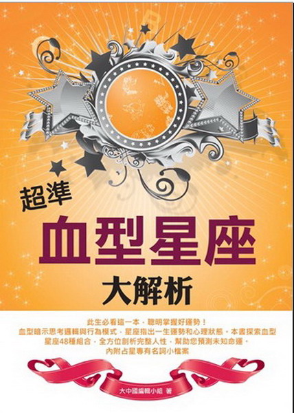 超準血型星座大解析 這本《 超準血型星座大解析》,一開始簡單介紹了占星學的歷史沿革,並將十二星座的基礎學理:陰陽性、三方星座與四正星座先作介紹,再依據每個星座說明基本特質,並詳列此星座的關鍵元素,對於星座的描繪生動活潑,卻又不脫離原始星座本質。 並加上有趣的心理測驗,讓讀者檢視自己於此星座的特質比例的高低,再藉此提供愛情婚姻、家庭生活、職業選擇、理財計畫、穿衣哲學、休閒指標、健檢小站等建議資訊,是一本具備知識性、趣味性、並富有參考價值、可讀性極高的星座書,若一般大眾尚無暇研究專業占星理論,這本書提供的豐富資訊,將可讓您簡單上手解讀十二星座。 結合星座與血型來做性格判斷,可以得到更精確的結論。舉例來說:一般而言,天蠍座女子談起戀愛是既黏膩又善妒,佔有欲極強的。但 B型和 AB型可不一樣, B型天蠍座會比較不拘小節、大而化之,但 AB型天蠍座則是個冷靜、精明的戀愛高手。再舉一個例子,情感熱烈而澎湃的獅子座若是 O型,簡直是火上加油,讓他激烈的性格更加突顯:若是保守的 A型,他的情感就會理智一些,而不會那般狂野不羈。 事實上,單是依據血型或星座來推算一個人的性格,是有失偏頗的。同是 A型人,同樣的生長環境,對事物的看法、興趣或對愛情的態度和看法卻有不同的認知和表現,是什麼原因導致這樣的情形呢?主要是因為出生時天上星曜位置的響所致,也就是我們平常說的星座。 占星術根據的是個人出生年月日,而血型分析的對象則是個人繼承父母、家族而來的身體和血液。出生的時間是天生自然的,占星術可以讓我們對「人的生命特質、一生的傾向、感情及心理狀態」有進一步的認識與了解;血緣是一整個家族骨肉相連的關鍵點,透過血型我們可以掌握到「人的思考邏輯及行為模式」,這一點不難明白,個人的習慣養成,本來就和他生活成長的環境有密切的關係。 因此,當綜合二者來分析判斷時,我們可以從更多角度來進行檢測,也會有另一番全然不同的見解。而兩者的搭配也出現了四十八種不同模式的組合,比單就星座,或單就血型來做分析,來得更為準確及客觀,也有助於我們更深入地去了解人性。