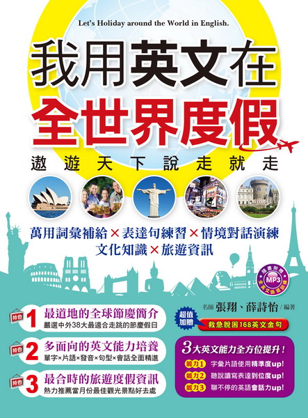 我用英文在全世界度假:遨遊天下說走就走(附1MP3) 讓英文成為紀錄假期的語言,用英文在全世界輕鬆度假。 中外重點假期簡介,用文化知識陪你歡度全世界的Holidays! 熱愛度假的西班牙人說:「工作就是為了要度假。」透過及時行 樂,克服人生苦短;有志難伸不要緊,只要心情準備好、口袋有裝 飽,再加上把英文訓練好,隨時隨地都可乘著飛機出走全世界!38 個年度重要假期簡介,帶你學習各具特色的假期文化知識。 實用英文詞彙+表達訓練句+實境對話範例,全面提升英文能力 列舉假期相關詞彙片語,主題式學習法深化詞彙印象,讓你成為最 knowledgeable的詞彙運用家。條列假期萬用表達句,學習英語 陳述句型,讓你成為最expressive的英語說寫者。透過實境對話 範例練習英語互動會話,培養最interactive的口語對答力。多面向 的英文能力培養,單字+片語+發音+句型+會話能力全面提升。 逐字句標示標準發音法,搭配MP3跟讀,聽力+會話力雙效精進 獨創KK音標全句標示,逐字句顯示標準英語發音法。搭配外籍老 師親錄MP3跟讀,訓練聽力+口說表達力,培養英文好語感,提升 聊不停的英語會話力。 環遊世界補給站,推薦當月度假BEST去處 一年十二個月分,按月推選一個建議旅遊國度,用一年份的時間走 透全世界。無論是想去巴黎看鐵塔、想去紐約看自由女神像、還是 想去澳洲被無尾熊抱,想出走看世界就趁現在,想啟動流浪計劃就 趁當下! 度假必備英文情境句,供假期出遊隨時運用 精選168條度假必備英文金句,依情境做分類,供度假旅遊隨時應 用。逐句附上完整音標,搭配MP3訓練聽力、跟著唸同時訓練發 音,出國旅遊再也不怕開不了口。