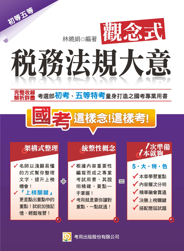 觀念式 稅務法規大意(五版) 本書內容層次分明、條理清楚,若為初次學習之使用者,可針對作者提示之重要章節,多次反覆地練習以加強印象,必能於應試時達到最佳的效益,掌握拿分的關鍵技巧!若同學們已有教科書,則可以曾經習讀之教科書為主,再輔搭配本書重點整理加以融會貫通,作為考前衝刺之準備。 每章於本文附有練習題以釐清章節重點,並於章末提供考古題(附難題解析)供讀者進行單元演練;最後,更蒐集進階國家考試題目,供讀者實戰演練及觀摩近年考試之?題方向,提升應考實力,達到事半功倍之效。