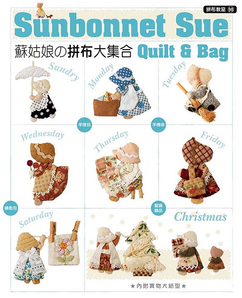 拼布教室(98):蘇姑娘的拼布大集合 日本亞馬遜網站讀者五顆星最高好評! 附贈:原寸實物大小版型 身為拼布迷,一定知道「蘇姑娘 Sunbonnet Sue」的傳說,她來自於美國1900年出版的暢銷童書《The Sunbonnet Babies》,因為太暢銷了,於是喜歡拼布的人,便根據主角的特色製作拼布:頂著大大的帽子、看不到臉部表情,卻能透過各種動作來表達情感的蘇姑娘,便成了拼布作品中非常受歡迎又常見的款式。 本輯【拼布教室】將要教大家如何用蘇姑娘做出各式各樣的拼布作品,有居家佈置、小物裝飾、外出包&隨身小袋,更有季節性的主題作品,最後再帶大家製作可愛的蘇姑娘娃娃!