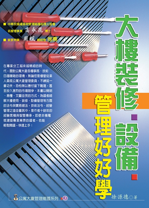 大樓裝修.設備管理好好學(2014最新版) 在專業分工越來越精細的時代,面對公寓大廈各種事務、技術日趨複雜的環境,無論您是樓管從業人員或公寓大廈管理委員,不練就一番功夫,恐怕無以應付當下難題,甚至投入激烈的市場競爭。本書以簡明、易懂、文圖並茂的方式,為讀者細解大樓使用、裝修、設備管理等方面的法令與實務做法,技術法令、經營管理之道並蓄其中,是作者十餘年的經驗累積與智慧傳承,即使非機電或建築專業背景的讀者,也能輕鬆閱讀,快速上手!