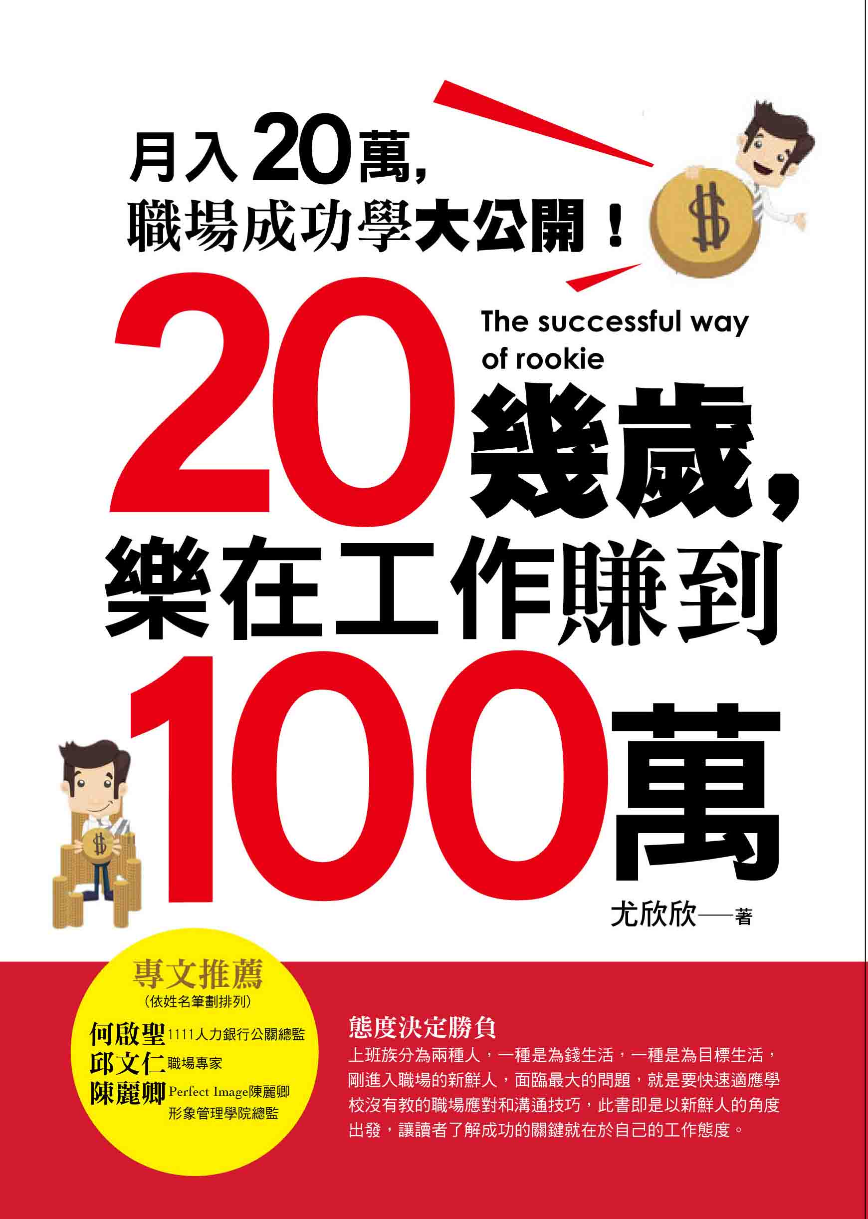 20幾歲,樂在工作賺到100萬 態度決定勝負 上班族分為兩種人,一種是為錢生活,一種是為目標生活,剛進入職場的新鮮人,面臨最大的問題,就是要快速適應學校沒有教的職場應對和溝通技巧,此書即是以新鮮人的角度出發,讓讀者了解成功的關鍵就在於自己的工作態度。 小改變成就大成功 想在新環境中有所成就、突破嗎?只要每天花一點時間,做一些小改變,落實書中的小習慣,時間久了,老闆自然會注意到你的執行力變高、企圖心變強,成功也會離你愈來愈近。 讓自己樂在工作 打破畢業即失業的迷思,掙脫失業,無薪假,裁員的夢靨,尋找自己的伯樂,讓自己做個樂在工作的上班族!
