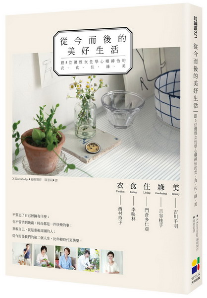 X-Knowledge X-Knowledge 【住】門倉多仁亞:一九六六年生。母親是德國人,父親是日本人,因為父親工作上的調動,從小就在德國、美國、日本長大。曾在外資証券公司工作,之後隨同丈夫前往倫敦學習料理。回國之後成為一個相當活躍的料理研究專家,同時出版了許多本關於德國流派的生活型態的書,倍受矚目。 【綠】吉谷桂子:一九五六年生。八O年代是活躍的商業設計師、藝術總監,九二年前往英國,在當地學習正統的園藝,回國後以園藝設計師的身分上遍電視、雜誌,並四處演講,獲得許多同世代的女性們的高度支持。包括箱根「星星王子博物館」在內,參與許多園藝的設施製作和園藝展。於澀谷區神宮前6丁目開設自己的服飾品牌「Shade YOSHIYA KEIKO」。 【衣】西村玲子:一九四二年生。二十四歲時從大阪來到東京,開始從事插畫工作。以充滿自然而洗練風格的插畫和文章來表現時尚、住家、電影、旅行等各種不同的主題,著作多達兩百本以上。近年來更擴大創作的領域,觸角伸向拼布和相片的拼貼,積極地舉辦個展和寫作活動。 【美】吉川千明:一九五九年生。為美容師•有機專家,開設了「茱莉蔻青山店」((jurlique shop )「白金台biopascaldayspa」等重視自然感的沙龍和商店。二O一一年和妹妹神崎貴子以「職業女性的保健室」為概念,成立「櫻花治療院」,提供女性在肌膚和身體方面的專業諮詢。 【食】李映林:料理家 出生於韓國•濟州島 來日本之後,在日本結婚,育有三男一女,三子、長女也都是活躍的料理專家。以「飲食就是培育心靈和身體」的「藥食同源」的想法為主所設計的韓國料理依循四季的變化,非常重視和大自然之間的調和。除了在雜誌上連載,也參加電視和活動的演出,同時積極舉辦演講、食育的活動。