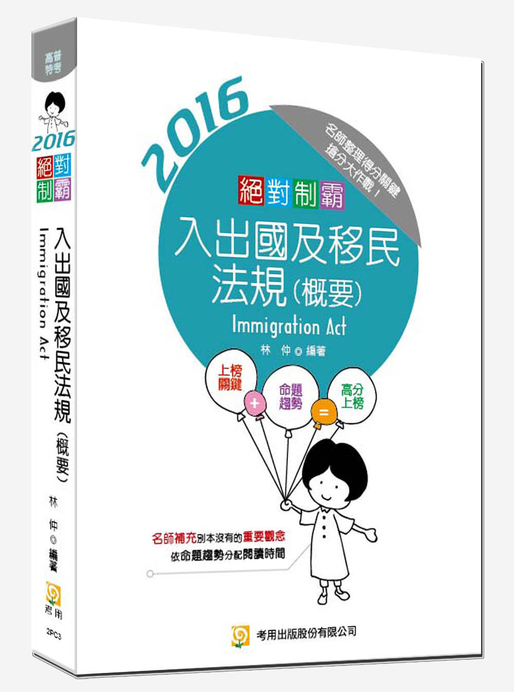 絕對制霸 入出國及移民法規(概要)(隨書附100日讀書計畫)(三版) 內容簡介 本書特色 名師整理得分關鍵 搶分大作戰! 上榜關鍵+命題趨勢=高分上榜 名師補充別本沒有的重要觀念 依命題趨勢分配閱讀時間 本書簡介 全書體例 1.本章架構 讓考生可以先了解本章大概的內容。 2.關鍵焦點 提出本章最關鍵的考點,考生可以特別針對此部分加強閱讀。 3.榜首導讀 點出本章最關鍵的考點,考生可藉由上榜前輩的提點直接切入重點閱讀。 4.命題趨勢 提出本章佔各年度的考題數,讓考生可以依命題趨勢分配閱讀時間。 5.閱讀完成日 可記錄唸完本章的時間,再複習時可以供參考。 6.上榜關鍵 針對內文延伸出重要的觀念,或是老師提醒考生應該注意的地方,增進應考實力。 7.強化申論實力 針對內容較艱深的部分作例子補充或說明,讓考生一目瞭然。 8.練功坊 學習一段重要觀念後,馬上進行練習,增加記憶。 9.附錄 最新試題 書末最新試題除供考生練習外,每題亦附上出題的本書章節,如果有不清楚的地方,可以快速翻閱該章節,再進行閱讀。