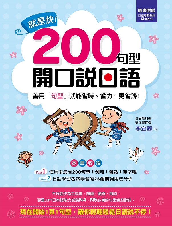 就是快!200句型開口說日語(附MP3) 內容簡介 說日文哪有那麼難。 就是快!200句型開口說日語 善用「句型」就能省時、省力、更省錢!! ★隨書附贈 日籍老師親錄例句MP3�\ 本書收錄 Part1 使用率最高200句型+例句+會話+單字帳 Part2 日語學習者該學會的28個助詞用法分析 不只能作為工具書,隨翻、隨查、隨說, 更是JLPT日本語能力試驗N4、N5必備的句型速查辭典。 現在開始1頁1句型, 讓你輕輕鬆鬆日語說不停! 本書以Part1的「句型」介紹、「例句」與「會話」說明、與主題相關的「單字補充」作為主軸,加上Part2的「助詞」用法比較分析,深入淺出地解說日語學習者該知道的200個初級句型。 一開始,先介紹句型的接續方式,並直接學習實用例句與會話,瞭解句型的使用情境,最後補充相關實用單字,讓讀者可以思考其他可代換的單字,幫助學習者確實掌握句型的意思與用法。 本句型書不只能夠作為工具書,隨翻、隨查、隨說,還可作為學習用書使用,更是參加日本 語能力試驗N4、N5的學習者必備的句型速查辭典。 本書特點 ☺由PART1的200句型和PART2的28助詞所構成。 ☺將日語中使用率最高的基礎句型全收錄。 ☺採用1頁1句型的簡易架構與解說方式。 ☺是新日檢N4、N5級別的句型速查辭典。 ☺是學習者可自修習成的初級日語文法書。 ☺是助詞分項解說與用法比較的專業用書。 ☺是日語教師解說文法時必備的私房祕笈。