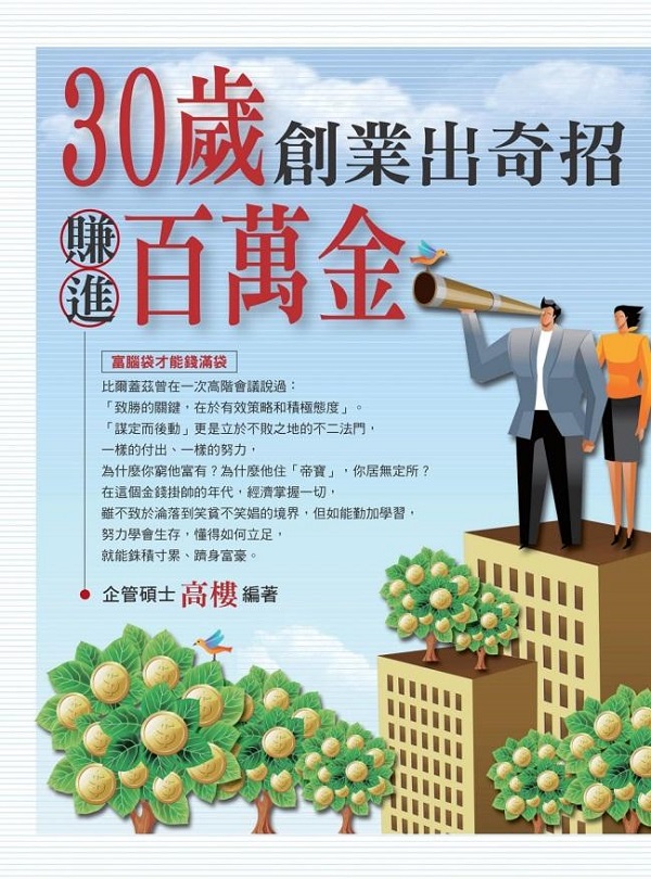 30歲創業出奇招˙賺進百萬金 本書特色 富腦袋才能錢滿袋 比爾蓋茲曾在一次高階會議說過:「致勝的關鍵,在於有效策略和積極態度」。 「謀定而後動」更是立於不敗之地的不二法門,一樣的付出、一樣的經歷, 為什麼你窮他富有?為什麼他住「帝寶」,你居無定所? 在這個金錢掛帥的年代,經濟掌握一切,雖不致於淪落到笑貧不笑娼的境界, 但如能勤加學習,努力學會生存,懂得如何生存,就能銖積寸累、躋身富豪。