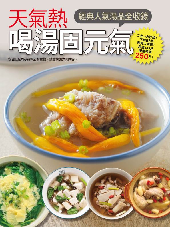 天氣熱喝湯固元氣 暢銷食譜二合一合訂版!原定價449元,限量特價250元!下殺56折大回饋! 本書是以下兩本書之合訂版,內容資料恐有重覆,購買前請詳閱內容。 簡單66 天氣熱喝蔬菜湯最好 炎炎夏日走在街上,總是沒走幾步路就滿頭大汗,這時候一定要多補充水分和元氣才行,其實夏天喝碗暖湯反而特別能消暑降溫,而且更是保養身體的飲食方式。但是夏天光想到要喝熱湯就覺得是酷刑,想要喝得健康,喝得清爽無負擔,不妨試試以蔬果為主食材的蔬菜湯,可以藉此平日不足的補充纖維素和營養素。 本書收錄超過200道蔬菜湯,有一般家庭必喝必煮的家常湯,食材簡單準備,馬上就能快速完成,也有道地異國餐廳的熱門湯品,不管是清湯濃湯,羹湯煲湯,通通收錄讓你一次學會,更教大家如何善用新鮮蔬果的特性,煮出又鮮又甜的蔬菜湯,喝了絕對清爽一整個夏天! 別刊147 最受歡迎雞湯海鮮湯排骨湯 本書收錄近180道最受歡迎家常湯品配方,利用雞肉、排骨、海鮮等最常見的煮湯食材,教讀者輕鬆燉煮各種經典人氣好湯。只要善用變化搭配的副食材,並且掌握煮湯的訣竅,想快煮、想慢燉通通都沒問題,即使新手,也能成功煮一鍋美味好湯,滿足所有人的味蕾!