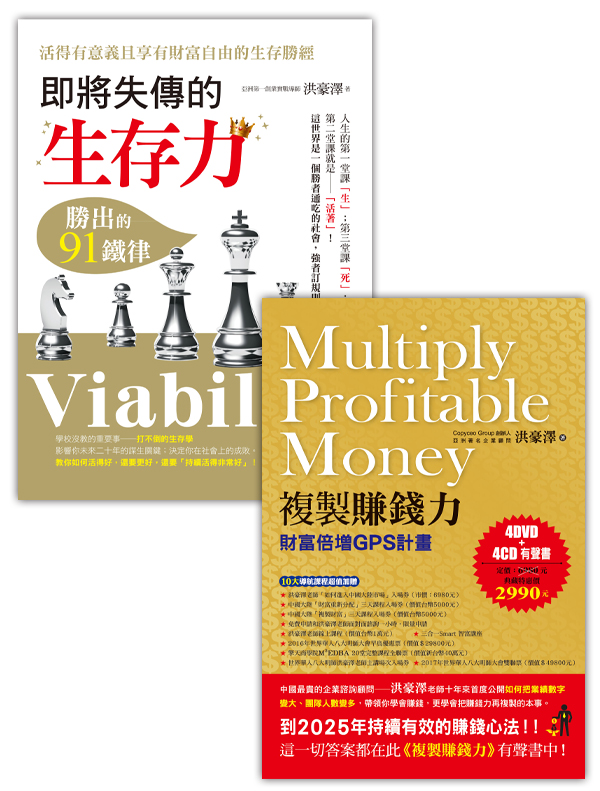 即將失傳的生存力(書+有聲書) 內容簡介 1.《即將失傳的生存力~勝出的91鐵律》 本書將傳授你學校沒教的重要事──打不倒的生存學 影響你未來二十年的謀生關鍵;決定你在社會上的成敗。 教你如何存活得好,還要更好,還要「持續活得非常好」! 什麼是「持續活得非常好」?不僅要活得有意義,還能過著財富自由的日子! 凡是在學歷社會求生存的人現在都應該讀一讀這本書! 2.《複製賺錢力(有聲書4DVD+4CD)》 本套有聲書將教會你── 建立系統,複製賺錢團隊──複製10倍速賺錢力 學會如何經營企業,建立系統與團隊的本事! 學會把錢變多,把人變多的本事! 學會這輩子永遠都窮不了的本事! 學會賺錢、更學會把賺錢力再複製的本事! 學會白手起家,空手致富的本事! 學會從台灣出發,在中國大陸甚至全世界賺錢的本事! ISBN 書名 9789862715475 即將失傳的生存力~勝出的91鐵律 9789862715734 複製賺錢力(有聲書4DVD+4CD)