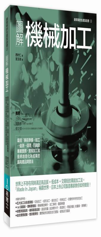 圖解機械加工 高效率加工×節省時間×提高產值 創造高利潤最優化加工應用書 產品製造產業鏈上下游的設計者、採購人員、品保人員、行銷業務等,不可或缺的整體機械加工知識,非理工科出身的初學者也能讀懂。 「車床?銑床?鏟花?雖然常聽到這些名詞,但卻一知半解。」 「對產品來說,什麼才是最佳加工法?」 「有所謂兼顧品質又快速便宜的加工方式嗎?」 製造現場重視「品質、成本、交期」三原則,以加工角度來考量,即為「製造品質」、「製造成本」和「加工時間」。並沒有可以同時滿足以上三要素的加工法,因此各種加工法應運而生。必須從中挑選出當下最合適的方式,挑選時可依據加工形狀、加工精度、加工時間、工具機來做選擇。 本書從加工類別著手,搭配簡單易懂的圖解說明,可讓讀者扎實理解機械加工入門知識。同時,因設計人員會考量加工法來繪製圖面,所以也會介紹有關圖面設計者的想法。 本書內容特色: •一本讀懂五大加工法 切削加工、成形加工、接合加工、特殊加工、改變材料特性的加工 •搭配145張圖面解說,更容易理解加工程序 •各種量具檢測,確保製造品質 直接測量(游標卡尺、分厘卡、高度規……)、間接測量(量錶、厚薄規……) §日本讀者實證推薦§ 「本書介紹了各式各樣的加工法,對於想要廣泛但簡單了解機械加工知識的人,這是最推薦的一本書。」 「文科出身的製造業相關從業人員必讀!將複雜的加工知識,以相當淺顯易懂的方式解說。」 「對於機械加工已有某些程度知識的人來說,這本書或許稍嫌簡單;但是它的內容很全面,而且對於我這種完全沒有概念的人來說,非常容易入門。」