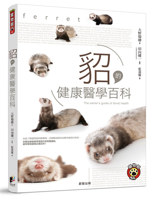 中文書名:貂的健康醫學百科 原文書名:よくわかるフェレットの健康と病気 內容簡介 由最了解寵物貂的獸醫師詳細解說, 維持愛貂健康必備的健康百科! 所有貂飼主都該擁有的一本書! 特別設計「貂的症狀索引表」,幫助飼主查找病症對應疾病! 貂的三大疾病有胰島素瘤、淋巴瘤、腎上腺疾病,都是常見於貂的腫瘤性疾病。除此之外,生性好奇喜歡啃咬物品的貂,也常發生胃腸道內異物吃下不該進肚的東西。為了維護愛貂的健康,了解各種常見於貂的疾病非常重要!本書將帶領飼主認識這些常見疾病的成因、主要症狀及治療方法,幫助飼主及早發現愛貂的異常、及早治療! ●為了守護愛貂的健康,需要了解貂的身體構造! ◎貂是怎樣的生物? 活潑好動、有著旺盛好奇心的貂是夜行性動物,聽覺敏銳。皮膚密布著皮脂腺,散發著特殊的體味(麝香味)。有銳利的爪子但無法像貓爪一樣往內縮。披毛有兩層,一年有兩次換毛期。貂的體格體長腿短,身體的柔軟性極佳。屬於肉食性動物,而且因為腸道很短的關係,所需的消化時間也很短。 ●預防勝於治療,做好健康管理才能避免讓貂生病! ◎守護愛貂健康的十大守則: 1. 充分了解貂是什麼樣的動物。 2. 了解每一隻貂都有自己的個性。 3. 打造合適的飼育環境。 4. 給予適當的營養。 5. 讓貂保持充足的運動量。 6. 和貂維持充分的互動。 7. 避免讓貂承受過度的壓力。 8. 具備貂常見疾病的相關基本知識。 9. 找到值得信賴的動物醫院。 10. 做好日常的健康確認工作,以及一年一度的健康檢查。 本書特色 ★為貂飼主們精心編寫的醫學百科! 幫助貂飼主們在日常生活中觀察愛貂的健康情形,補充健康檢查及日常照護等預防疾病發生的醫療相關知識,讓疾病及早發現及早治療! ★詳細解說貂的身體各個部位疾病! 癌症腫瘤、牙齒、眼睛、消化器官、泌尿器官、生殖器官、循環器官、外部寄生蟲、病毒性疾病等。全面解說各種疾病發生原因、症狀及防治方法。 ★解決疑難雜症、終身受用! 緊急救護方法、高齡貂的照護及安養等,傳授為貂量身訂做的照護技巧,讓愛貂保持健康與活力!