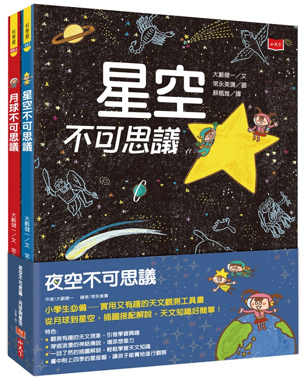夜空不可思議:月球與星空(全套2冊) 內容簡介 小學生必備-實用又有趣的天文觀測繪本 從月球到星空,插圖搭配解說,天文知識好簡單! ★本系列特色: 1.以繪本方式帶領孩子觀測天文現象,引發學習興趣 2.穿插有趣的神話傳說,增添孩子的想像力 3.一目了然的插圖解說,輕鬆看懂天文知識 4.附有月亮盈虧日曆與四季星座盤,讓孩子能實地觀察 陪伴學習天文知識最好的方法,就從觀測開始! 月亮、星星是小朋友從小就認識的天文名詞,但是如何向孩子解釋陰晴圓缺、行星運行、潮汐、公轉自轉,往往是爸爸媽媽頭疼的課題。 本套書收錄《月球不可思議》、《星空不可思議》兩本書,用繪本的方式,將艱澀難懂的天文知識包裝成淺顯易懂、輕鬆有趣的內容,讓爸爸媽媽能帶著孩子閱讀,甚至出外做實地觀測,一起探索夜空中的奧秘! 《月球不可思議》 你有多久沒有抬起頭看看夜空中的月亮了呢?月球,這顆人們幾乎每天都看得見,離地球最近的天體,你一定再熟悉不過了!但是,要是你和大多數人一樣,覺得天天都看得見的月亮沒什麼了不起,那你可能會因此錯過好多好多會讓你張大嘴巴並感到不可思議的天文知識! �你知道兩千多年前古希臘人是怎麼靠著一根棒子,計算出地球周長及月球周長呢? �如果站在月球上,你會發現,明明看見太陽升起了,天空卻是一片漆黑,這是為什麼呢? �新月、上弦月、滿月、下弦月,月亮形狀的變化規則又是怎麼一回事? �我們真的永遠也看不到月球的另一面嗎?日蝕和月蝕跟月亮又有什麼關係呢? 《月球不可思議》將按部就班引領你觀察夜空中那一輪有著許多有趣祕密的月亮。看完之後,你一定會很驚訝,原來月球有這麼多奇妙有趣的祕密。 《星空不可思議》 你喜歡抬頭仰望夜空嗎?夜空中最明亮的是月亮,旁邊還有許多閃亮的星星,你知道這些星星是怎麼運行、有著什麼樣的故事嗎?常常聽到有人說「水星逆行」是什麼意思呢? 古代人看到滿天的星星,運用想像力,將它們串連起來,加入希臘神話的故事,成為現在全天的88個星座。本書中將介紹春、夏、秋、冬每個季節中最重要的星座,如何找到它們以及它們的故事。此外,還介紹星星的運行軌跡、太陽系的8大行星、不可思議的行星軌跡、銀河、流星群的觀測、星星的大小、距離和顏色等等,是一本充滿可愛圖畫的知識繪本,也是夜晚觀星不可或缺的工具書。