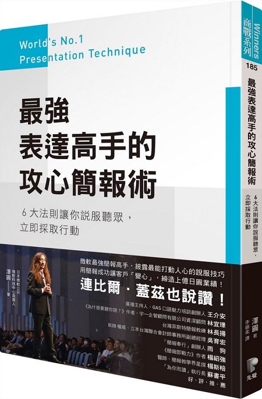 原文書名:マイクロソフト伝説マネジャーの世界NO.1プレゼン術 中文書名:最強表達高手的攻心簡報術:6大法則讓你說服聽眾,立即採取行動 微軟官方認證!最強表達高手的攻心簡報術 連比爾.蓋茲也說讚! 微軟最強簡報高手,披露最能打動人心的說服技巧 用簡報成功讓客戶「變心」,締造上億日圓業績! 他的簡報,是客戶買單的關鍵因子, 連續7年,在微軟官方舉辦的發表會上,得到聽眾最高評分殊榮。 他只是一介工程師,公司業務卻最想帶他去向客戶簡報,甚至連客戶都特別請他去向高層簡報! 本書不只告訴讀者如何完美地完成一場簡報,更重要的是作者認為每位簡報者,心中都該有改變聽眾想法、促成聽眾採取行動的信念,並以此為基準去設計簡報。本書除了介紹高手簡報的技巧(如手勢、語氣、聲音的調節)與投影片的設計之外,也介紹展示一場好簡報的「微軟流6大心法」。 讀完這本書,你的簡報將不再只是看起來完美,也會讓聽眾覺得有幫助、有用處、有價值! 傲視微軟全球12萬名員工的簡報高手, 披露最能打動人心的表達與演說心法!