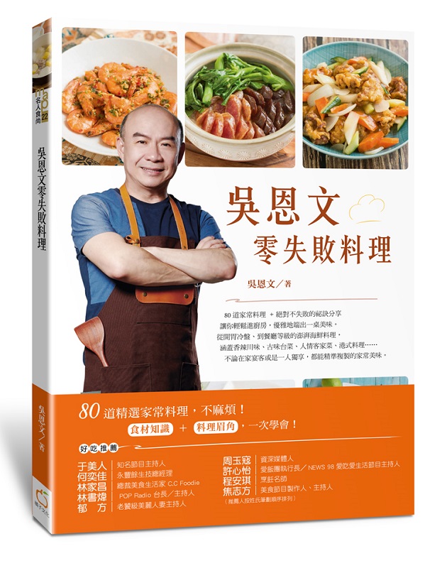 吳恩文零失敗料理 內容簡介 今天你想吃哪一道? 從家常番茄炒蛋到噴香的牛肉麵, 從廣式料理、眷村美味、台式佳肴、四川名菜到客家美食, 吳恩文親身揭開每道菜的成功精隨,更悉心提點祕訣, 讓你廚藝大躍進,燒出一手好菜! *技法傳授與食材知識集大成 火侯的控制,油量的多寡,以及食材如何分切,都是足以影響一道菜的關鍵。不說你不知道的名廚小習慣,其實就是菜肴的美味關鍵。 *精選80道必學家常料理 吳家紅燒肉、川式椒麻雞、超好吃的客家小炒,吳恩文家裡的日常料理,不藏私大方分享,80道嚴選菜色,讓你家的餐桌天天有變化。 *因應現代家庭規模的多變料理設計 一鍋牛肉湯,可以變化出三種料理;一鍋排骨湯,也可以化身麻辣鍋;還有學會自製雪裡紅,炒盤年糕、煮碗麵,隨心所欲,讓小家庭和一個人也能享受經典風味。 好吃推薦 知名節目主持人 于美人 永豐餘生技總經理 何奕佳 總裁美食生活家 C.C Foodie 林家昌 POP Radio 台長/主持人 林書煒 老饕級美麗人妻主持人 郁方 資深媒體人 周玉寇 愛飯團執行長/NEWS 98愛吃愛生活節目主持人 許心怡 烹飪名師 程安琪 美食節目製作人、主持人 焦志方 (順序按姓氏筆畫排列)