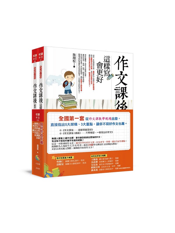 寫好作文不難──238個作文課後學生作文案例及寫好作文方法(一套共二冊) 內容簡介 全國第一套從作文課教學現場出發,直接指出五大架構、三大重點,讓你不寫好作文也難。 ◎《作文課後──這樣寫會更好》 ◎《作文課後(續篇)──不用補習,一樣寫出好作文》 每個人都曾上過作文課,當你拿到老師批閱後的作文,有沒有不知如何著手改進的經驗? 這是一本特別的作文書,適用於學校的作文課,以及會考、學測、國家考試等測驗。揭開鮮為人知的作文課後現場,指出238個學生撰寫作文的問題及弊病,並佐以改寫範文對照,讓你知其然更知其所以然,瞬間提升你的作文力! 寫作很難嗎?由作文名師親自指導。找出寫作的迷思、常犯的錯誤等,從作文五大架構:題目、首段、結尾、段落、篇章,提出要注意的三大重點:詞句、修辭、敘事。並依學生作文原文、解釋、範文改寫等三個層次,讓你親臨作文課後現場,閱讀老師紅筆圈評及改寫後的範文,有助提升你的寫作功力。 ◎原文:為學生所寫的作文,找出其優點及缺點,老師紅筆圈出。 ◎解釋:剖析原文之不足與迷思、錯誤與缺漏。如師親臨,諄諄善誘,提供適當的建議。 ◎改寫:多由老師親自撰寫範文,以供學生學習對照。