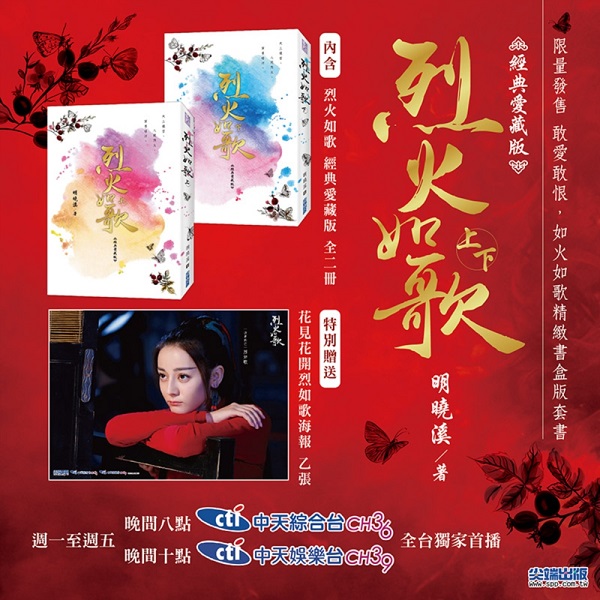 烈火如歌(敢愛敢恨,如火如歌精緻書盒版套書) 內容簡介 百年前,我想與妳相守。這一次,我只想保妳一世平安。 ♥ 歡慶2018收視排行榜TOP10、點擊率最速破50億的江湖仙俠大戲《烈火如歌》登臺,特別製作陸劇流量女王迪麗熱巴「敢愛敢恨,如火如歌精緻書盒」版套書,限量發售! ♥ 雪歌CP虐你千百遍,附贈花見花開烈如歌海報一張! ♥ 最高顏值仙俠劇話題不斷,《烈火如歌》於2019/01/04起週一至週五,晚間八點在中天綜合臺、晚間十點於中天娛樂臺同步播出! ▌經典愛藏版隆重推出,全文重新編修,上集收錄全新前傳〈烈火九音〉,下集收錄後傳番外! ▌改編同名電視劇,由周渝民、迪麗熱巴、張彬彬、劉芮麟領銜主演! ▌《三生三世十里桃花》幕後原班人馬打造電視劇,《步步驚心》、《何以笙簫默》金牌編劇「墨寶非寶」操刀劇本,加上《琅琊榜》、《擺渡人》的殿堂級美術服裝團隊,與《如懿傳》、《獨孤皇后》、《扶搖》並列2018最受期待古裝劇! ▌晉江總積分突破2億、當當網好評率100%,《泡沫之夏》、《旋風少女》、《明若曉溪》作者明曉溪玄幻鉅獻! ★上集★ 再多一些時間,試著愛我。妳會愛上我的,因為——我是那樣愛著妳。 十九年前,暗河宮一夕之間傾頹,烈火山莊躍升江湖最大勢力,成為正派之首。 莊主獨生女烈如歌靈動活潑、嬌俏可人,在眾人疼愛之下,與莊主義兄之子戰楓及皇子玉自寒兩位師兄一同長大。她和戰楓青梅竹馬,訂下山盟海誓,戰楓卻移情別戀,背棄了她。 為挽回所愛,烈如歌隱藏身分潛入青樓,盼能習得一身「才藝」,意外邂逅一名出塵而神祕的男子--銀雪;身為青樓的「第一美人」,銀雪本應在競價者間選擇未來的主人,卻在眾目睽睽之下,一指點中了在旁看戲的烈如歌。 由於銀雪的不依不饒,如歌將他帶回山莊。然而,自十九年前便醞釀起的陰謀,卻因此浮上了檯面── ★下集★ 如果活著的代價是傷害到你,那麼,就讓我死掉好了── 為解開玉自寒身中的惡咒,烈如歌對銀雪百般哀求,卻沒想到,替玉自寒解了咒的銀雪虛弱無比,化做點點光芒、消散於空氣之中。 仙人並不會死。然而,若被迫陷入沉睡百年,於凡人而言,又與死何異? 如歌回到烈火山莊,參加戰楓的喜宴。雖是喜宴,氣氛卻詭譎萬分──前情人瑩衣大著肚子來鬧場,戰楓置之不理,反而繼續歡歌載舞;莊主烈如鏡則突然宣布,如歌將是下一任莊主,而非眾人認知的戰楓! 戰楓對莊主之位志在必得,玉自寒身陷皇權之爭,銀雪依然下落不明……經歷種種變故的如歌,卻像被解了「封印」似的,容貌越漸美麗、武功更是突飛猛進;暗河宮的爪牙,也頻頻在江湖中掀起波瀾── ★角色介紹★ 烈如歌 | 迪麗熱巴飾演 烈火山莊繼承人,武林盟主之女。武功不高且不諳世事,但純淨善良,靈動活潑,倍受他人喜愛。經歷種種變故後,武功日益精進。 座右銘:如果我憂傷,愛我的人也會憂傷。 銀雪 | 周渝民飾演 世外高人,武功高深莫測。容顏絕美,擁有多重身分。皇帝封他為王,武林盟主稱他為公子,他卻隱匿於紅塵,只為等待三世難忘的命定戀人。 座右銘:我忍受了長久的寒冷與孤獨,終於來到妳身邊。 戰楓 | 張彬彬飾演 烈火山莊大弟子,武林盟主義兄之子。俊朗而剛毅,寡言卻不失柔情,曾與青梅竹馬的烈如歌定下婚約,卻在一夕之間毀去,變得冷酷無情。 座右銘:這是天命,既然逃不開,那就讓我正面迎戰! 玉自寒 | 劉芮麟飾演 皇子靜淵王,烈火山莊二弟子。皇室爭權時遭人所害,自幼雙耳失聰、兩腿殘疾,被送到烈火山莊避禍。冷靜睿智、溫潤如玉,從小陪伴如歌,總是解救她於危難之中。 座右銘:這世間我唯一想要守護的,便只有妳。 暗夜羅 | 賴藝飾演(《三生三世十里桃花》劇版大師兄疊風) 暗河宮宮主,功力深厚,極度癡情卻又極其殘忍,愛而不得的痛苦成為他要讓天下人一起受苦的執念。 ★繞心佳句★ ♥ 再多一些時間,試着愛我。妳會愛上我的,因為——我是那樣愛着妳。 ♥ 一百年的嚴寒算得了什麼,反正她還要很久很久才能轉世;她不記得我也沒關系,我會記得她。這一世她已經吃了很多苦,我不要她的來世還很辛苦。我要成為仙人,記着她,等着她,從她一出世就開始保護她。 ♥ 如果你還喜歡我,請珍惜我。如果你不喜歡我,我會離開你。 ♥ 對不起,我不會放縱自己去想你。因為,如果我憂傷,愛我的人們也會受傷。 ♥ 青春是一杯烈酒,勇敢的人先乾為敬。