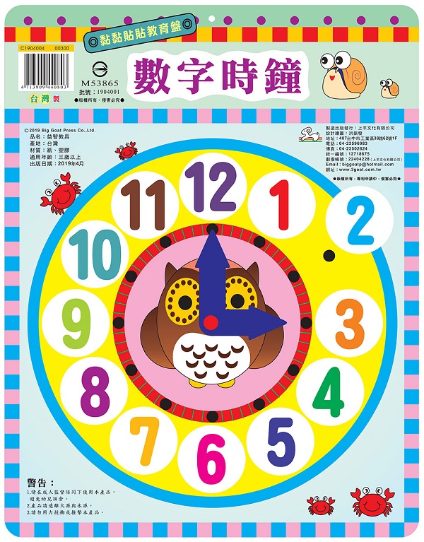 數字時鐘 內容簡介 1歲開始的優質教具--感覺統合、創意學習(Fun Creative Learning Happiness) 《數字時鐘》教導孩子認識時鐘,知曉數字與時間之間的關係,藉以引導孩子學習正確的配對。透過14個可以自由拆卸的黏貼零件,讓孩子可以不斷地反覆學習、認知,在遊戲中訓練記憶、學習時間與空間的概念、加強手眼協調與感官統合能力,理解部份與整體的關係,學習收拾歸位,養成良好的生活習慣。其特殊的學習方式被美國加州兒童發展學院視為最佳商品玩具的條件之一。 本產品的本體及黏貼組件皆為厚紙板+進口紙+防水膠膜印製完成,正反面具備防水功能,髒了擦拭即可恢復乾淨,不易撕裂毀損,魔術氈的黏貼採用特殊安全的熱溶膠黏合,堅固不易撕開,適合小朋友長時間的把玩與學習。 本產品為了品質考量,全部在台灣印製,手工黏貼裝訂,除了適合1-7歲的小朋友使用學習,也適合幼稚園教學、啟智教學,或作為特殊教育或復建的輔助教具..... 。 ◎感官啟發、創意學習,本產品可以幫助孩子… •認識數字與數量,知曉數字與數量之間的關係。 •學習用拼圖火車車廂連接模式,了解空間概念與辨識能力。 •學習幽默、激發創意、靈活思考,訓練記憶。 •訓練手眼協調及造型圖像辨識的能力 •訓練分類,理解部份與整體的關係。 •培養收拾歸位的良好習慣。 •增進親子互動。 本書特色 1.本商品特殊的學習方式被美國加州兒童發展學院視為最佳商品玩具的條件之一。 2.教具本體與黏貼組件皆作防水膠膜,髒了擦拭即可恢復乾淨。 3.材質 : 厚紙版、防水塑膠膜;特黏性魔鬼氈,可重複撕起、黏貼。 4.全部台灣印製,手工黏貼裝訂。 5.適用範圍 : 1-7歲小朋友、幼稚園教學、啟智教學、特殊教育、復建輔助教具.....。