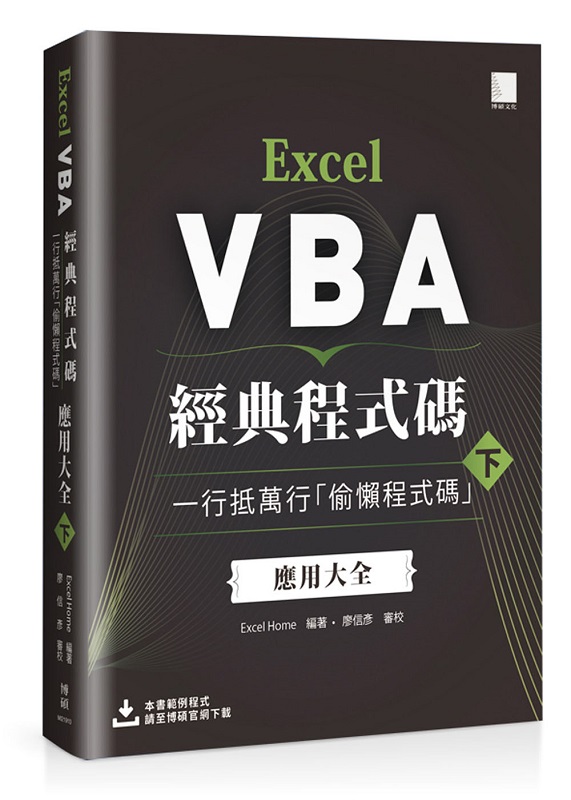 Excel VBA經典程式碼:一行抵萬行「偷懶程式碼」應用大全 (下) 內容簡介 高手不藏私的萬用工具箱,讀者只需稍加修改程式碼,即可應用全書所有實戰案例! 本書特色 本書由多位微軟MVP頂尖專家所領軍,其團隊擅長大數據商業智慧(BI)、企業級大型資料庫、Excel數據分析及建模經驗、實現高效與自動化辦公等多項領域,主要任務是針對稍有Excel VBA程式設計基礎的讀者,提供大量Excel VBA的經典用法及程式碼,透過詳盡的講解,加速理解Excel VBA的各項技術特點,進而達到現學現用的效果。 讀完本書,您將學會: ♦ Excel VBA基本知識和方法,有效提升工作效率與自動化水準 ♦ 獨特的程式設計,展現及發揮Excel VBA的精髓 ♦ 提升Excel資料處理與分析的實戰技巧 ♦ 打破Excel常規局限,實現難以實作的功能 ♦ 擴充Excel內建功能,補充功能豐富的VBA技術 好評推薦 「本書全面展現 Excel VBA 的各項應用,從整體配置到知識架構,完全遵循使用者的學習規律,其中可學習到操作 Excel 物件、檔案系統操作、互動設計、資料庫應用、進階程式設計,以及程式碼最佳化等系統性知識,有助於掌握 Excel VBA 的各種面向與精髓。」 ─────Excel Home雲課堂學員 向緒志 「如果急需學習 Excel VBA ,卻又茫然不知如何入手時,不妨拿起本書。它內容厚實,條理清晰,圖文並茂,講解深入淺出,沒有程式設計基礎的新手也可以快速上手操作。書中貼近實戰的案例,只要稍加改動程式碼,即可應用於工作中,可說是不可多得的工具箱!」─────Excel Home雲課堂學員 任宣秈