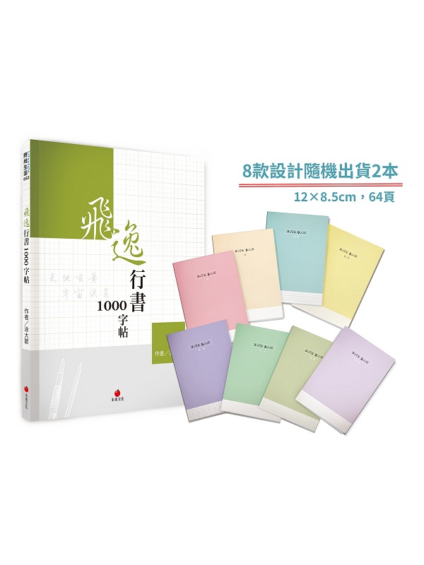 飛逸行書1000字帖+1號巴川紙筆記本 內容簡介 四大特色 精彩絕倫 .以古今書法家必寫之「千字文」為學習內容,千字皆不重複,生動不枯燥! .每個字的筆順皆有標示,宛若一部小字典,八字成一,加上釋義,練字兼讀書。 .附加作者精選作品集,觀看作者如何營造「行氣」。 .部分內容附上書寫示範影片,看老師如何寫出一手美字! •古今書法家必寫的「千字文」,作者以行書為書寫筆法,讓讀者學習行書硬筆字之美,並嫻熟古文,學習更有趣!8個字一頁,字數剛好,學習沒壓力,一旁還有文句解說,練字讀書不耽誤。 •書中附上數篇作者作品集,練字帖臨時,作者的作品集就是最佳範本。 •「活」的習字帖!作者製做多款寫字示範影片,只要掃描QRCODE,就可以看到老師如何一氣呵成寫好字。 1號巴川紙筆記本(8款設計隨機出貨2本) 規格: 尺寸:12×8.5cm 頁數:64頁×2本 封面顏色×內頁設計:桃色×無地、裸色×米字、鴨綠色×橫罣、鵝黃色×方眼、冰紫色×米字、翠心色×無地、橄欖色×方眼、粉霧色×橫罣 日本進口巴川紙,紙薄卻滑順不透色,是最適合鋼筆字使用的書寫紙,臨帖完《飛逸行書1000字帖》之後,再以「1號巴川紙筆記本」書寫,揮灑篇篇經典,永久保存這美好的字字句句!
