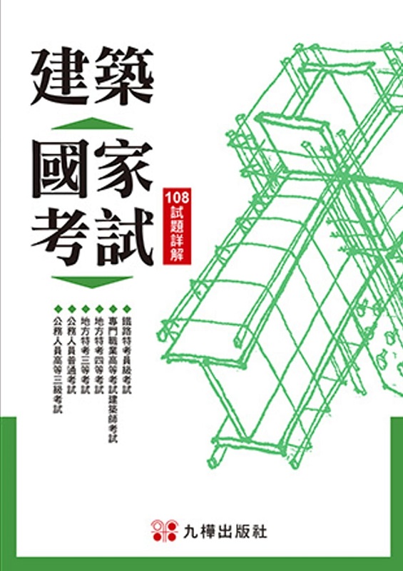 建築國家考試:108試題詳解 內容簡介 完整收錄108年度國考各次試題及詳解,由九樺各科老師通力製作。解題過程完整清晰,易讀易懂,得以印證重要觀念,強化學習效果,使考生熟悉出題形態,培養應試能力及作答技巧,是一本不可或缺的專業參考用書。