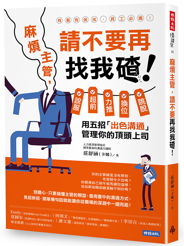 麻煩主管,請不要再找我碴!:說服、超前、力推、換位、跳脫,用五招「出色溝通」管理你的頂頭上司 內容簡介 有看有保佑,員工必備! 一本讓頂頭上司從此不再找你麻煩的必備大補帖! 你的主管總是沒有原則,老愛朝令夕改嗎? 你覺得自己做牛做馬績效達標,但要求加薪加職卻總是輪不到你嗎? 只要搞懂主管的類型,善用書中的觀察與溝通方式,見招拆招,就能讓你從職場的深淵中一躍而起! 用對招術,過關斬將,一路順暢。 本書翻開前警語 人沒有十全十美,我們要找的不是完美的主管,而是能順利工作的應對方式,才不會讓職場工作者每天都在忍耐中度過。 狀況:如何得到主管的支援? 使用招術:說服,少報憂、多報喜 狀況:報告總是一再被修改,連標點符號也有意見? 使用招術:超前,提出想法、整合觀點、超前檢查 狀況:請示主管時,總回應要再請示高層怎麼辦? 使用招術:力推,魚幫水水幫魚 狀況:主管有私心要如何取得資源? 使用招術:換位,貼近邊緣的言談 狀況:討厭主管,該怎麼與他共事呢? 使用招術:跳脫,要尊敬、勿互鬥 書中還有更多的教戰守則、職場攻防,企業指定頻率最高的溝通力講師卡姊傾囊相授,一次教你成為拳拳到位的職場武林高手! 專家推薦 Emily 空姐報報Emily Post版主 何則文 「職涯實驗室」社群創辦人/暢銷書作家 李崇言 安達人壽總經理 夏國安 訊連科技人資行政部協理 謝文憲 選秀節目「誰語爭鋒」總導師 (以上按姓氏筆畫序排列) 以前曾碰過控制狂老闆,讓我這種不喜歡被框架綁住的人超級痛苦,如果當時有這本書,我至少可以試著從溝通方式改變,讓自己的職場生活好過一些。不管你的上司多麻煩,學會這五招「出色溝通」,就能幫你在職場上趨吉避凶。--Emily 向上管理是許多初入職場的年輕人最害怕跟不擅長的,到底怎麼樣跟老闆講話才不會踩地雷,怎樣溝通才能讓自己展現專業獲得支持呢?閱讀由知名企業講師卡姊多年內功心法傳授的這本書,保證讓你能把自己的老闆應對得服服貼貼!--何則文 透過有效的各種向上管理的小撇步,駕馭你跟老闆之間的關係;促動職業生涯中每個共事過的老闆,個個都能成為你人生的貴人,協助你職場生活順暢,讓工作與職場變成每天開心的桃花源。--李崇言 主管與部屬的相處,總像一齣連續劇,每天上演著不同的劇情。不論是哪一種戲碼,都希望可以入戲,讓互為對手的兩位能彼此惺惺相惜、共創佳績。--夏國安 卡姊這本書,我很推薦招術二、四、五(超前、換位、跳脫)等三個篇章,對所有在向上管理上遇到困難、嘗盡苦頭的職場工作者,會有暮鼓晨鐘、警世提醒的良好功用,對於實務做法,更提供了有效藥方。--謝文憲 �X即日起至6/30止,企業購書100本/次,卡姊即無償至貴公司演講一小時。 詳情請洽:(02)23066600轉8215王小姐