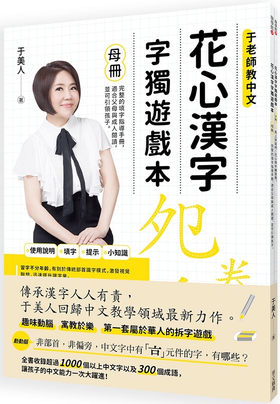 花心漢字字獨遊戲本Vol.1(母冊+子冊套書) 內容簡介 揮別傳統識字方式,以創新「梅花圖填空」聯想學習法提升大腦字彙庫 名「O」其實,中間是哪一個字?裝「O」作啞的「O」究竟該怎麼寫? 你能藉由一筆一畫將字彙正確書寫出來嗎? 于美人老師特別以花卉圖像作為聯想基礎,透過常用的部首或偏旁作為花心,讓大人小孩以輕鬆學習的方式,在花瓣上填入適當漢字,激發腦部記憶體和提升大腦字彙資料庫,一邊練字一邊學習,讓「寫字」能力不被打字所取代,同時也能增強使用字彙的正確性。 ✿填字遊戲 藉由花心的部首或偏旁聯想,於花瓣上填入對應漢字,透過拆解漢字結構而加強對於每一字的熟稔度和邏輯性,如以「又」為花心,則可發展出「取」、「反」、「叔」,「友」等字。 ✿挖空提示 利用成語或句子提示來加強對於漢字的記憶和認識,同時也能夠增強用字的正確度;並可以藉由成語學習來提升國文造詣,讓用字遣詞更具深度。 ✿知識補給站 「義薄雲天」和「人情涼薄」,同樣是「薄」就具有不同寓意。透過知識補給站則能加強對於漢字的認識和使用方式,讓你不再用亂用成語,或寫作、打字錯誤連篇。 本書特色 于美人扛起漢字傳承重責大任, 回歸中文教學領域最新力作。 趣味動腦,寓教於樂──字讀,第一套屬於華人的拆字遊戲本。 非部首,非偏旁,中文字中有 元件的字,有哪些? 8歲到88歲都愛不釋手!全民腦運動,一起動手寫一寫! 全書收錄超過1000個以上中文字以及300個成語, 讓孩子的中文能力一次大躍進! ★小朋友玩,強化字彙結構學習 ★大人玩,挑戰已生疏的手寫字彙 ★老人玩,活化腦力更年輕 「媽媽,站牌上寫永寧站到屁腸站。」捷運上,五歲的Max問我。 「寶貝,你説的是『昆陽』站吧!」美人姊啼笑皆非地回答。 你知道嗎?在眾多電視節目上談吐幽默、口條清晰的知名主持人于美人,較不為人知的,其實曾是國文科的補教名師! 因為從自己孩子身上,意外發現跳脫部首、「視覺學習」、「圖像化拆解」的認字方法,領略到世人學習語言的過程和方式其實並不單一。 為了能造福更多視覺學習的孩子,也為了疏於提筆寫字的現代人,於是有了以「圖像學習」為主軸的花心填字練習本的誕生。 美人姊這樣說:「出這套書不是讓你增加壓力,漢字數獨(暫定書名)充滿樂趣,三五好友相招,一起來競逐字形大師寶座!」 以弘揚繁體字之藝術美、傳承文化為己任的于美人老師, 透過獨樹一幟的「梅花圖填空」聯想學習法, 衍生而成圖像記憶填字本,一筆一畫逐步提升認字量, 在遊戲中啟發學習識字能力。 •街道的街字,筆畫好多、好難,記不住。 美人姊教你:「街」是很多行人走的地方,「行」人走的地方有很多「土」,「行 + 土 + 土」,咦,不正是街道的「街」! 在科技進步與資訊快速的世代下,手機語音和電腦打字功能逐漸取代書寫,加上每位學齡孩童學習狀態不盡相同,傳統認字方式可能已經不適於每位學童。有鑑於此,曾擔任國文老師的于美人特別開創「梅花圖填空」聯想學習法,讓大人小孩能夠透過遊戲式的圖像記憶,增強識字能力。 ✿本書有別於傳統部首識字模式,藉由常用字的部首或偏旁,以花朵填空方式,激發視覺聯想,幫助各年齡層迅速提升識字量。 ✿習字不分年齡,主要針對8-88歲想要練習漢字的讀者,透過成語提示、 梅花填字練習,以輕鬆活潑且無壓力的方式增強對於漢字字型認識,附帶簡短的字源講古(知識補給站),同時也能強化華語知識。 ✿藉由解構重新認識每個漢字的組成和意義,如包含「侖」的漢字,就有「輪」、「綸」、「崙」、「倫」等,念法相同,意義卻不同,讓你不再生活運用上錯字連篇。 ✿藉由一筆一畫的書寫加強對於漢字的記憶,同時也能透過練習寫字沈澱心靈,在聯想的過程裡激盪大腦,活化思考和記憶能力,還能練得一手好字! ✿本書分為子母冊,親子在一問一答中共同遊戲練字,不但可以促進親子關係,也能時刻掌握孩子學習狀態,重新為自己找回正確字的用法與觀念,子冊可撕式設計,師生間也可一起同樂,在刺激的遊戲中引發孩子的學習興趣。