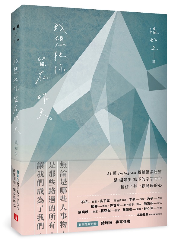 我想把你留在昨天 內容簡介 無論是哪些人事物, 是那些路過的所有,讓我們成為了我們。 21萬Instagram粉絲溫柔盼望, 是溫如生寫下的字字句句,接住了每一顆易碎的心。 【作家】不朽、【新生代演員】吳子霏、【作家】李豪、【作家】角子、【作家】知寒、【創作歌手/詩人】許含光、【詩人】陳雋弘、【作家】陳曉唯、【作家】蔣亞妮、【演員】簡嫚書、【作家】蘇乙笙 真摯推薦! #檸檬水──是心甘情願的回味 我們遇見彼此就在我們杯裡的水最滿的時候。 只要輕輕一晃,就會有什麼跟著水灑出來。 一直以來,動盪的是我們才對。 #暗物質──是無以解釋的秘密 在你決心讓我成為你無法深刻的回憶後, 我才終於明白,你渴望自由的眼睛, 原來也曾經那樣溫柔地看過我。 #腹語術──是有口難言的失語 哪怕在你離開以後, 我都沒有再想起過我們之間死去的愛。 因為我知道死去的不只有愛。 #朝聖者──是一如既往的相信 疼痛是別人給的,卻要自己痊癒。 所以練習勇敢的第一天,你要學會當一個, 在受傷的時候,能夠給自己包紮的人。 「我想把你留在昨天」募集一封封投擲於時光大海的信,由如生精心挑選64個「昨天」,以詩文將愛過、恨過又或錯過的片刻凝鍊成永恆。 親愛的你,好久不見的你……「你」是曖昧過的人、是分手的人,是好友、是家人,甚至可能是自己。並肩散步的路,輕聲哼唱的歌,輾轉反側的夢,我們相互取暖,又各自負傷。 在悠長的回望裡,那些關於愛與痛的過往都被一一收妥。遺憾有了溫暖的理解,錯過則有了救贖的可能。當每一個昨日都好好地放下了,我們終於敢毫不遲疑地出發。 書封設計背後 把每一個「昨天」冰封起來, 一片片、一塊塊,慢慢地組成我的「今天」。 承認受過的傷並沒有讓自己變成更好的人, 但路過的各種「昨天」, 終將能用一抹溫暖與各種憂傷、煩惱、酸澀和解。 封面選用日本新浪潮紙, 微微粗糙的手感與白色燙印, 呼應那些不平整,卻又或深淺或銘印心中的每個片刻。 名家推薦 我們曾經都是彼此的傷疤,後來也成為了彼此的救贖。 這是一本這樣的書,在成長的路上充滿著遺憾,卻仍然向光的地方前行,我們感激一路相伴的溫柔時光,珍惜過彼此眉眼裡的理解與原諒,一直到愛與痛都有了解答。 ──【作家】蘇乙笙