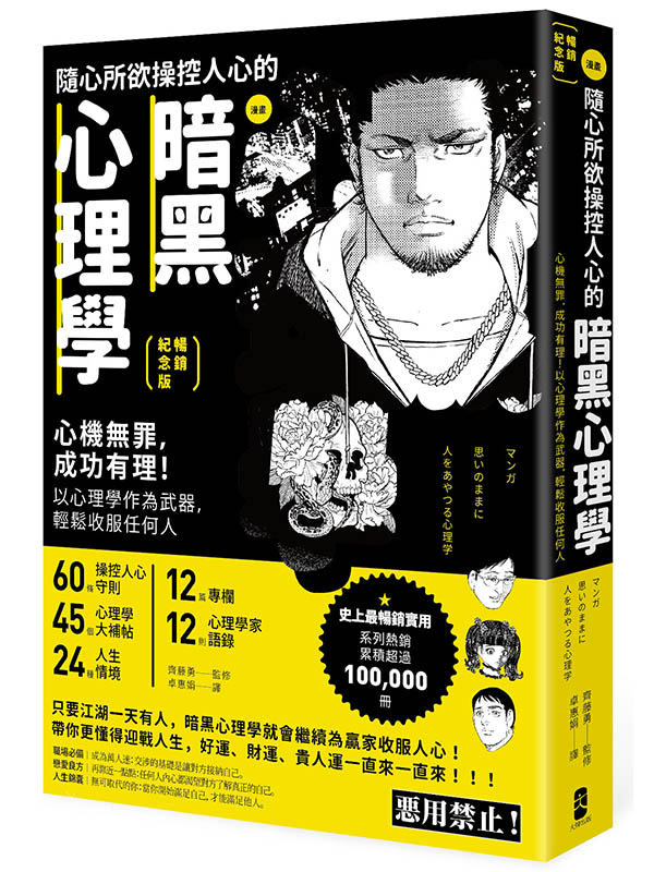 漫畫 隨心所欲操控人心的暗黑心理學:心機無罪,成功有理!以心理學作為武器,輕鬆收服任何人【暢銷紀念版】 內容簡介 只要江湖一天有人, 暗黑心理學就會繼續為贏家收服人心! 帶你更懂得迎戰人生,好運、財運、貴人運一直來一直來! ★史上最暢銷實用!★ 系列熱銷累積超過100,000冊 一個工作不順的上班族, 一個總是在愛情中受傷的小資女, 還有一個失去人生方向的魯蛇…… 正當他們面臨人生最大的危機時,一位神祕男子現身了! 這個看似凶狠無情的神祕男子,竟幫助這三人得到了遠大於金錢的財富與幸福。 而一切的關鍵就在於──能否懂得活用「心理學」! 瞞天過海的讀心術,不是神話,而是種訓練! 你不必知道別人在想什麼, 只要讓對方「以為」你很了解他, 你也能輕易控 制 人 心! 60條操控人心守則 X 45個心理學大補帖 X 24種人生情境 12篇專欄 X 12則心理學家語錄 ──進可攻、退可守的操控人心大全── 想得到幸福的人,必讀! 全方位適用的溝通法則 適當放入誘因:掌控對方心理,讓他不自覺接受要求。 展現同理心:讓對方覺得「被理解」是一大重點。 令對方感受到他是獨特的:任何人都渴望對方想著自己。 善用話術,抑制反對意見:讓對方沒有「委屈妥協」的感覺。 製造取得正向回覆的氣氛:沒人想當破壞好氣氛的傢伙,降低談判破局的頻率。 【人際關係】 交涉的基礎是讓對方接納自己 → 巴南效應:利用模稜兩可的內容,一語道破對方個性。 → 同步技巧:配合對方的動作與說話方式,讓對方爽快承諾! → 臉的角度心理效果:臉部保持20度,給他人的印象最好。 【職場必備】 隨心所欲操控部下或主管 → 溫莎效應:繞一圈讓第三者傳達你的讚賞,瞬間征服主管與部下! → 畢馬龍效應:越不成才的傢伙越要誇奬! → 群眾心理:樹立「共同敵人」,就能提升團體士氣。 【戀愛良方】 迅速拉近與曖昧對象的距離 → 哀兵策略:留下「沒有結束」的感覺,讓他有還想見面的期待。 → 沉沒成本效應:感情圓滿的祕訣,是讓對方不自覺為你費心費力。 → 善意的自尊理論:對方心情低落時,是感情升溫的絕佳機會。 心機無罪,成功有理! 最實用的收服人心必殺技,讀這本就夠了! 從此好人壞人敵人陌生人 ──→ 都將成為你的致富貴人! 作為武器,心理學能讓你更懂得迎接人生挑戰與幸福。 心理學是一門建立在嚴謹科學實驗上,研究人及非人動物的心理現象、精神功能和行為的科學領域。本書以簡單易懂的方式,在漫畫中舉出大量而具體的實例,呈現這些符合心理學原則、極為有效的技巧。不論是商場上的談判心機、職場人際關係、戀愛中的兩性相處,或是個人生涯規劃,相信一定能在關鍵時刻為你帶來極大的幫助。 雖然下了「操控人心」的標題,但在這裡想強調並不是懷著惡意操控他人。而是希望閱讀本書的讀者,能夠了解自己具備這樣「操控人心」的力量,並學會運用自如。將這些心理技巧作為迎接人生挑戰的有力「武器」,並逐漸自覺擁有的「力量」而成長,展開豐富充實的人生,獲得更多更多的幸福。