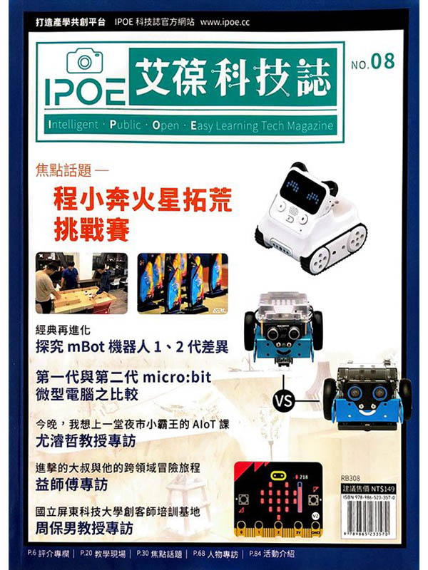 目錄 一、評介專欄 1. 經典再進化-探究mBot機器人 1、2代差異 2. 第一代與第二代micro:bit微型電腦之比較 二、教學現場 1. CyberPi+mBuild 物聯網應用 2. AERC亞洲創新教育與機器人競賽 簡介 3. 亞洲機器人運動競技大賽-程小奔火星拓荒挑戰賽 4. 創客師認證暨教具捐贈計畫 學習歷程不留白 5. 創客師培訓基地增加創客師資 採訪國立高雄科技大學 6. 疫情下的問題導向學習模式:以資訊創新課程實作為例 7. 自造巡禮-蘭潭自造教育及科技中心-楊元彰專訪 8. 數位策略當道 一探3D列印醫療應用-陳加恩專訪 9. 尋找妙點子-10個方法做出創意專題 三、人物專訪 1. 今晚,我想上一堂夜市小霸王的AIoT課-尤濬哲教授專訪 2. 進擊的大叔與他的跨領域冒險旅程-專訪益師傅 3. 國立屏東科技大學創客師培訓基地-周保男教授專訪 4. 把布拉格的春天帶到台灣的後花園-專訪丹尼爾 四、活動介紹 花蓮全國首創線上程式設計競賽 以光環板促進居家健康