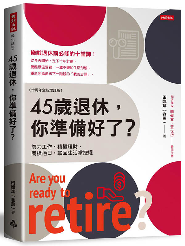 45歲退休,你準備好了? (十周年全新增訂版) 內容簡介 努力工作、積極理財、簡樸過日,拿回生活掌控權 Are you ready to retire? 樂齡退休前必修的十堂課! 知名作家 李偉文、黃世岱 贊同推薦 從今天開始,定下十年計劃, 脫離汲汲營營,一成不變的生活形態;重新開始追求下一階段的「我的志願」。 45歲退休是我這輩子做過最英明的決定! 寫這本書時我50歲,是第一本書,接著陸續寫了八本,當了四年街頭藝人,每年旅行超過一百天,到過近百國家,演講分享上百場,參加過幾十次路跑,一次單車環島,也經歷過數次大小金融危機。罹患過青光眼、憂鬱症等疾病。 過去十年是我人生至此最豐富、有趣,和有意義的十年,書出版後有人問我會不會後悔提早退休?我開玩笑說「那是我這輩子做過最英明的決定」,要是現在再問同樣問題,我會很認真地回答「那是我這輩子做過最英明的決定」,即使人生重來,還是會做同樣選擇。 第1堂課 渴望:你知道自己要什麽,不要什麽嗎? 第2堂課 金錢觀:足夠就好、簡樸生活、破產上天堂 第3堂課 理財規劃:有「足夠」生活費,不是賺「很多」錢 第4堂課 自發性簡樸:節儉不是美德,是必要手段 第5堂課 閱讀和旅行:建立獨立自主精神世界,延展生活方式的可塑性 第6堂課 職志:活到老,學到老,玩到老,工作到老! 第7堂課 健康管理:維持健康不是為活得久,是為活得好! 第8堂課 人際關係:務必善待那位永遠不離不棄的朋友──自己! 第9堂課 選擇居住地:讓自己成為一個走得出去,隨遇而安的地球公民! 第10堂課 放下:越過三座大山──金錢,面子,生死