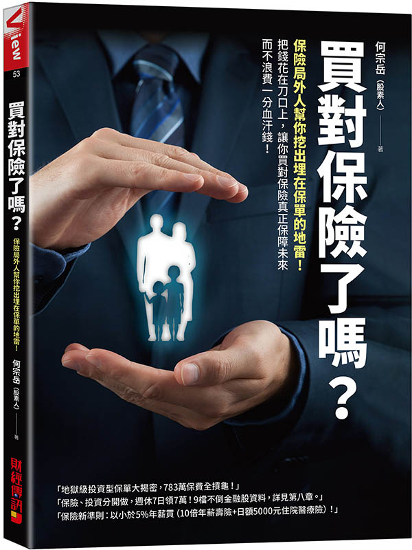 買對保險了嗎?:保險局外人幫你挖出埋在保單的地雷!把錢花在刀口上,讓你買對保險真正保障未來而不浪費一分血汗錢! 內容簡介 保單中藏了多少地雷,你知道嗎? 直揭業務員絕不會告訴你的關鍵小細節!!! 舉例來說: 投資型保單到底幫你賺錢還是賠錢? 要留心!它極有可能變成「地獄保單」! 真要買投資型保單的話,作者建議你不妨這樣做──純保障壽險+投資金融股 投資型保單有一個內扣的費用,保險成本(簡單的說就是保險公司用來支付理賠的費用)。它是直接由你的保單帳戶價值中扣除。因此你很難察覺這筆支出。如果你的保單帳戶價值,小於保險成本,那麼你就要開始繳危險保費,否則保單就會失效。 保險成本幾乎是隨年齡而成等比級數增加,例如男性60歲的保險成本是30歲的10.3倍,作者初步估算,如果你的投資保單的投報率是3%的話,保單價在87歲時失效。如果投報率是0%,會在67歲失效。許多投資人沒有弄清楚,到時白忙一場。說它是地獄保單,也許有點誇張,但不是全無道理!作者在書中公開友人的1,000萬元投資型保單,10年共繳了783萬元保費,但是,保單卻依舊失效,保費全歸零! 2019年台灣的人均GDP 25,539美元,全球排行第33,但是,壽險滲透度卻是連續12年全球第一,台灣人平均以五分之一的薪水買保險,不可謂不多!但是據調查自認為已有足夠保險保障的受訪者僅占53.1%。 由上觀之,台灣人的保險觀,明顯出了問題。作者認為以下為台灣民眾買保險的最大迷思。 (1)買保險,保障項目要愈多愈好。 沒有錯!但是每月保費可能太高而影響基本的生活品質。 (2)買保險,要保障兼投資,一舉兩得。 保障兼投資?絕對是保障成份減少(理賠時方恨少),投資也未必賺錢,有虧本金的風險。 (3)買保險,到期未理賠時,要領回保費。 如果是儲蓄壽險,到期尚可領回比總繳保費稍多的錢(不考慮通膨率),但是,如果附加一大堆的附約,或終身醫療險,則必然領不回總繳保費。 (4)繳費20年、保障終身最划算。 羊毛出在羊身上,保險公司只不過將保障至110歲的保費,要你在20年內付清而已。 此四項觀念並非完全錯誤,而是有時候正確;但就因為這四項多數人的買保險觀,保險公司才會投大眾所好,設計許多高保費、低保障的①終身型、②還本型、③投資型、④類全委型及⑤附保證型等保險商品來賺客戶的錢。 其中終身型保單比較貴的可能原因之一是:「目前台灣人平均壽命是80.9歲(男77.7歲、女84.2歲),壽險業的第六回「經驗生命表」,是男81.11歲、女86.64歲(2021/7/1),但是,各保險公司的終身型保單卻依99歲、105歲或110歲年齡來計算保費」。所以,對相同保障而言,終身型壽險的保費,可能是10年期壽險的20倍以上。 作者是保險局外人,寫此書不是和保險公司有什麼過節,一開始純粹是因為小孫女出生後,媳婦要為她買一張0歲保單。「主約是20年繳的終身壽險,加上7種附約,年繳保費23,932元」,引發他對保險的興趣。 『直覺上,覺得替「0歲嬰兒」買保險好像怪怪的,通膨效應無止境,等她到35、50歲時的保單價值剩多少?因涉及家人的權益,乃決定進一步研究保險商品,希望能了解「要保人究竟能由保單獲得怎樣的保障」』。 作者重視思考的邏輯。1985年在他35歲,因自感「學然後而知不足」,乃決定放棄11年的工作經驗,前往美國攻讀機械碩士。當時的系主任認為「工程師必須懂統計分析」,規定研究生須到數學系修統計學課程,他選了一門統計分析學(Statistical Analysis),上課第一天,教授列了一些參考書籍,其中一本迄今仍記憶猶新、受益無窮的書是:《How to Lie with Statistics》(如何用統計學說謊);這是一本出版於1954年的小冊書,全書僅約150頁,共有10個小單元,書中文圖並茂,列舉了許多玩弄統計數據的案例和利用統計學騙人的技巧。 作者2年的碩士學習生涯中,並未覺得該書有何用途,然而,回國重新就業後,卻逐漸啟發他的「常識邏輯思考」潛能,對於日後工作上的空調節能評估分析,有很大的幫助。因此,邏輯思考→比較分析→檢討改善,成為作者研究資訊/數據的三步曲,作者曾以此三步曲,寫過《拒當下流老人的退休理財計劃》等4本理財暢銷書,本書即是以常識邏輯思考,進行比較分析,探討(人身)保險商品之必要性與適用性。 邏輯思考及常識貫穿全書的內容。作者一位40幾歲友人想買的保單如下,並問作者的看法。 這是○○人壽的「20年繳/終身意外險」,在16歲至50歲買此份「20年繳/終身意外險」的保費,同樣是17,390元/年。保費並無年齡上的差異,20年的總繳保費共347,800元;此份保單給付項目多,還有101歲祝壽金10萬元,看起來很吸引人。 作者告訴他,此是終身意外險,疾病死亡或疾病住院醫療非本保單之保障範圍,而且還得挑假日搭大眾運輸工具而意外身故,家人才能領得到800萬元的保險金,否則只好忍耐活到101歲領10萬元祝壽金,加減算一算,他就改買其他保單了。 姑且以常識邏輯來分析此份保單:「住院2,000元/日,每次最高6萬元(※即住院30天×2,000元/日),需要住院174天(=總繳保費347,800元÷2,000元/日),才能花完總繳保費,可能嗎?看看自己父母及周遭親朋長輩,有多少人因意外住院超過174天? 本書作者在分析台灣保險市場的怪現象之後,也提出了他的保險觀念。 保險三訣:救急不救窮、錢花刀口上、保大不保小! 更具體而言: 以小於年薪5%金額,買500萬元保障險(10倍年薪)+日額5,000元住院醫療險。 任何想要買保險,或是已經擁有保