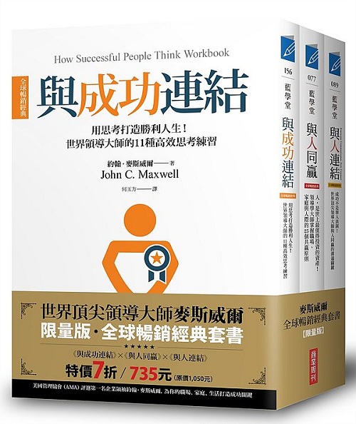 "世界頂尖領導大師 麥斯威爾 限量版 全球暢銷經典套書 《與成功連結》+《與人同贏》+《與人連結》 美國管理協會(AMA)評選第一名企業領袖 約翰.麥斯威爾 為你的職場、家庭、生活贏得正向連結,打造成功關鍵 影響《財星》雜誌(Fortune)前500大企業、全球500萬名領導者 著作暢銷50國,在全球銷售超過三千萬冊 「為什麼麥斯威爾的書暢銷?因為他的觀點既清晰又有用!」──鮑伯.班福德(Bob Buford)《人生下半場》(Halftime)、《完美收場》(Finishing Well)作者 《與成功連結》 成功者的祕密,在腦袋裡!因為他們比別人先想到,所以才做得到。 成功者知道如何解決問題、創造機會,因為他們的腦袋就是不一樣,而且時時刻刻在思考。但是「思考」很抽象,普通人該如何換上成功者的腦袋?麥斯威爾研究企業、學術、運動、政壇……各領域成功者將近半世紀,他發現:成功者的思考有方法,而且人人都可以學習!世界領導學大師麥斯威爾教你學會11種成功者的思考法,與成功連結。 《與人同贏》 有哪種投資可以長長久久?答案是人! 麥斯威爾看見許多人為了職場、家庭等人際問題而困擾,因此將他演練長達近半個世紀的「人際技能」,總結成書中25項原理,不僅改善了人際問題,更將人與人的力量「相乘」,擴大個人與企業的成功機率,打造致勝人生! 《與人連結》 世上沒有解決不了的問題,只有不會溝通的人! 成功不是一場單人表演!想要有效溝通、獲得成功,「連結」就是一切!連結是一種能力,可以認同對方、與他們產生共鳴,增加你對他們的影響力。溝通和連結──是發揮潛能、改善人際關係與領導的一切基礎!全球最具影響力的領導大師的致勝連結法,無須天分與經驗,人人都能學習且實證有效,立刻提升生活、事業與家庭的高效能溝通! ◎套書特色 1.國際級領導大師實證的成功法則,打造你的致勝人生! 2.精彩案例討論,帶來更多的反思及體悟! 3.邊讀、邊練習、再應用的務實成長手冊!"