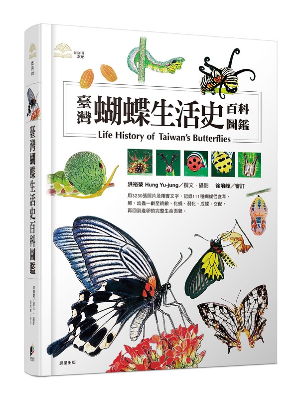 作者簡介 洪裕榮 熱愛大自然的攝影愛好者,1996-1997參加國際沙龍年度積分賽,在自然幻燈組獲得排名第12名;1998年進入世界攝影10傑第3名;1999年進入世界攝影10傑第5名。期間亦獲獎無數,如第20屆臺北國際攝影沙龍:「郎靜山大師紀念獎」。2005年通過「國際攝影藝術聯盟 FIAP」獲頒EFIAP(Excellence FIAP)高級會士認證。 在獲獎無數後,轉身竭盡10餘年光景,全心投入拍攝及撰寫蝴蝶生活史。構思以蝴蝶生活傳記為出發點,透過鏡頭來呈現牠生命的全貌,採用的圖片經過嚴選去蕪存菁,從食草、卵、一齡至終齡、蛻皮、前蛹、結蛹、羽化、成蝶交配、產卵等,完整紀錄整個蝴蝶成長的過程。 出版及攝影簡歷: 1989 開始學習攝影。 1996 成立黑白暗房,拍攝臺灣人文影像記實。 1996 彰化縣攝影學會,授與博學會員。 1997 開始專注投入大自然生態影像記錄。 1998 學習高階暗房技術,授藝開陽專業攝影。 1999 開始觀察記錄蝴蝶與植物間之自然關係。 2003 出版《臺灣之美•1》蝴蝶攝影輯。 2003 「國際攝影藝術聯盟 FIAP」頒發 AFIAP (ARTISTE FIAP) 認證。 2004 出版《臺灣之美 •2》蝴蝶攝影輯。 2005 「國際攝影藝術聯盟 FIAP」頒發 EFIAP (EXCELLENCE FIAP) 認證。 2005 參加彰化縣文化局「2005半線藝術季」攝影邀請展。 2006 參加彰化縣花壇鄉公所「花壇鄉志—文化篇」藝術活動人物介紹。 2008 出版《蝴蝶家族/Families of Buterfly》攝影•蝴蝶圖說。 2010 趙建棣、洪裕榮、曾彥學;臺灣產牛皮消屬(蘿藦科)新記錄種「毛白前Cynanchum mooreanum Hemsl」。TAIWANIA ;55卷3期 (2010 / 09 / 01) , P324–327 。 2010 獲邀國立自然科學博物館「蝴蝶食草與蜜源植物特展」。 2013 貓頭鷹出版《台灣蝴蝶食草植物全圖鑑•Host plants of Taiwanese butterflies》攝影/蝴蝶食草圖說。 2013 晨星出版有限公司《2014台灣蝴蝶之美•Personal Diary》日誌。 2014 發現台灣新種植物馬兜鈴,由呂長澤、王震哲教授命名發表「裕榮馬兜鈴Aristolochia yujungiana」。台灣林業科學29(4):291-9。 2016 晨星出版有限公司《蝴蝶飼養與觀察》攝影/圖說。 2017第41屆台北國際攝影沙龍自然組 Nature Section評審委員。 2018第42屆台北國際攝影沙龍自然組 Nature Section評審委員。 2019呂長澤、洪裕榮、陳志雄,臺灣堇菜科的新紀錄種「廣東堇菜Viola kwangtungensis Melch」。台灣林業科學34(2):135-42。 2020 貓頭鷹出版《台灣蝴蝶食草植物全圖鑑•Host plants of Taiwanese butterflies》改版。 2021 暑往則寒來,春還則秋至,閒散過客覓食草,在水一方探蝶蹤。 2022晨星出版有限公司《臺灣蝴蝶百科圖鑑》撰文/攝影。