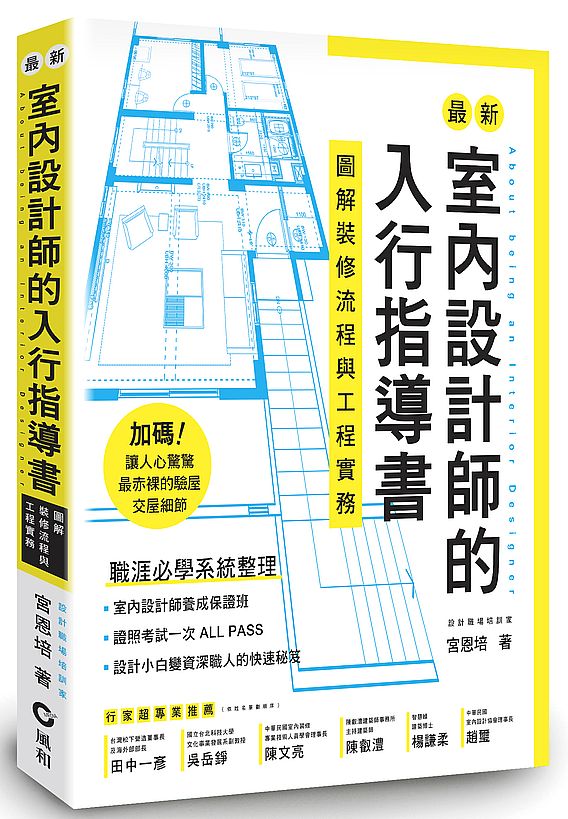 室內設計師養成保證 全台最詳細的室內裝修第一現場記錄 培養職人專業設計力與實務執行力 證照輕鬆考 一次PASS 行家超專業聯手推薦 台灣松下營造董事長及海外部部長 / 田中一彥 國立台北科技大學文化事業發展系副教授 / 吳岳錚 中華民國室內裝修專業技術人員學會理事長 / 陳文亮 陳叡澧建築師事務所主持建築師 / 陳叡澧 智慧綠建築博士 / 楊謙柔 中華民國室內設計協會理事長 / 趙璽 科班設計出身,未必就入得了行!室內設計看似門檻低,但想成就一片天,不是靠有心就好,更在乎實務與執行能力,跟著設計職場培訓家-宮恩培老師,一起認識相關工作環境,弄懂設計流程與內容,從提案、空間配置構成、料材工法、工程估價、到驗屋交屋,手把手親授各環節知識,你也能是獨當一面的一線設計師。 |10分鐘快速通關室內設計竅門| 設計師一日生活圈 估價單怎麼寫才不犯大忌,行家指點迷津 一條過的簡報提案法 平面圖繪製與材料板製作技巧:泡泡圖、空間關係表、動線分析圖,一次掌握 � 了解空間尺度,人體尺寸、活動尺寸與家具尺寸,制定最佳空間配置 |手刀圖解設計流程| 超受用的現場實務經驗 破解工程實務,按部就班不怕出紕漏 常用建材與工法分析 工務常見術語,不怕工班師傅有說沒有懂 |最高實用度—坊間沒說的驗屋細節| 買屋、裝修不吃虧 最貼近痛點的驗屋、交屋必知資訊,即使沒有驗屋公司,全靠屋主自己來,也不說『後悔』的檢驗秘技。 五感驗屋:視覺、聽覺、嗅覺、觸覺、心理檢測法 合約內容驗屋與品質驗屋 專業級驗屋小道具vs.生活版小傢俬:熱像儀、透明水管…等,現場驗屋功能大公開 |證照考試ALL PASS秘訣| 室內設計相關證件考照必讀資訊 好的室內設計師,不能只有一張『照』,專業證照愈多愈好,帶你選擇最佳證照。 國家考照相關申請資格懶人包 民間證照優勢比一比 PRO級的技術士報考高分私房訣竅一手公開。 商品特色/最佳賣點 想踏入室內設計,卻苦無門路;走進設計圈,卻不知該往哪發展好,作者以自身20多年經驗,微觀記錄室內設計師一日生活圈,深入工作環境、簡報提案、工地實務,連帶業界驗屋不可說的秘辛,全都鉅細靡遺圖像化室內設計流程,重點提醒裝修設計技巧,同時整理相關技術士證件考照應考注意事項,輕鬆取得入門磚。