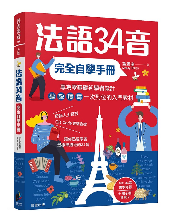 法語34音完全自學手冊 內容簡介 專為零基礎初學者設計 聽、說、讀、寫一次到位的入門教材 搭配母語人士錄製QR Code雲端音檔 讓你迅速學會最標準道地的34音! 附贈:34音書衣海報+電子檔音素卡 給渴望學到100%標準發音和語調的你 口形圖解+發音訣竅+字母寫法+生活單字+連音練習+常用會話 一次通通教會你! 保證跟著讀,馬上就會唸! ★解說詳盡,想學不會都很難! •語調規則:詳細說明發音、音節、語調與拼讀方式 •發音技巧:以口形圖解和注音、英文詳細輔助說明 •生活單字:最常用、最核心的重點必背單字與唸法 •基礎語法:結合語源由來與變化規則,不容易忘記 •連音練習:法語聽力與口說的關鍵,特別加強練習 •常用會話:現學現說,說出最道地的法國生活用語 本書特色 ◎作者精通中、法兩種語言,精準掌握台灣人學習法語的難處並且對症下藥 ◎隨書附贈法語34音書衣海報+電子檔音素卡,讓你每天看、每天認,自然而然深印腦海 ◎發音不標準別擔心,母語人士錄製QR Code雲端音檔,讓你學會最道地的發音和語調