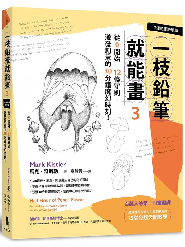 一枝鉛筆就能畫3【卡通動畫奇想篇】:從0開始,12條守則,激發創意的30分鐘魔幻時刻! 內容簡介 \美國亞馬遜藝術類暢銷書《一枝鉛筆就能畫1》最新系列作!/ ★百萬人的第一門畫畫課★ /最受世界各地大小朋友歡迎的25堂奇想天開教學\ ●從0延伸∞創意,開啟屬於自己的奇幻冒險 ●掌握12條關鍵繪畫法則,跟隨步驟自然學會 ●沉浸30分鐘畫畫時光,培養專注和感受的能力 「我的一位十歲諮商個案對我說:『傑佛瑞醫生,畫出這些圖,讓我覺得自己做了很酷的事!』這本書的繪畫練習能幫助兒童、青少年及成人達到自我發現的新高度,並帶領所有讀者去到更好的地方。」──傑佛瑞.伯恩斯坦博士(Dr. Jeffrey Bernstein) 《十天內,孩子不再是小霸王》作者、兒童與青少年治療師 最受歡迎的畫畫老師馬克•奇斯勒,帶著最新的創意畫畫課回來了! 在全球疫情爆發期間,馬克開辦了線上畫室「一小時鉛筆力」,為全球的大小朋友帶來滿滿歡笑,一起安然度過充滿焦慮和不確定性的隔離時光。 《一枝鉛筆就能畫3》從這個線上直播系列課程中,選出25個最受歡迎的主題, 成為每堂30分鐘的循序漸進課程,可以幫助平靜內心、表達自我,並且激發創意! 現在就跟著跳傘企鵝、香蕉忍者等25種頑皮可愛的角色,一起探索這個想像力無窮的世界吧! ●無壓力地享受畫畫的樂趣 不管是初嘗繪畫的小朋友、希望挖掘藝術天分的大人,只要跟著指引輕輕畫下第一筆線條,都能輕鬆畫出可愛活潑的卡通動畫人物。 ●將藝術大師的技巧運用自如 把文藝復興大師的訣竅化為簡單易學的技巧,學習他們如何以重疊手法創造深度、調和明暗突顯主題,畫出具真實感的生動作品! ●透過繪畫成為更好的自己 畫畫時能進入「心流狀態」,讓你更專心、更平靜,更有解決問題的自信,並帶著這股熱忱投入生活,創造力十足地持續成長! 「我深深相信就算只是每天做一點簡單練習,也能提供孩子一個具創意性的抒發管道。我希望這本書能鼓勵你的家人每天或每週撥出30 分鐘,踏上一場伴隨想像力的創意繪畫冒險!」──馬克•奇斯勒 本書作者 4個繪畫帶來的好處: •平靜內心 •激發創意 •表達自我 •持續成長 12個成為藝術大師的技巧: •前縮透視 •配置 •比例 •重疊 •明暗 •陰影 •輪廓線 •視平線 •密度 •額外的創意 •不斷的練習 •態度