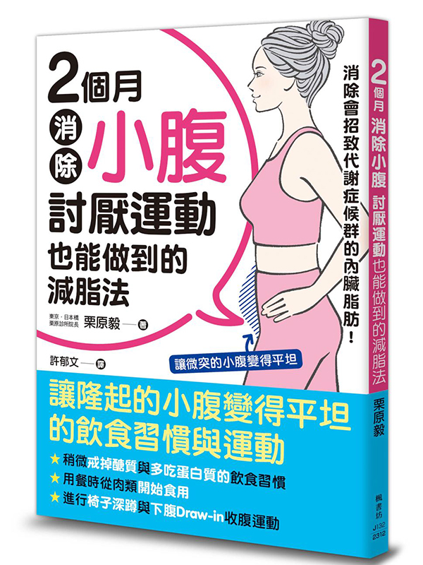 目錄 .前言 第1章 為什麼小腹會隆起呢? .你是否會在意小腹隆起呢? .小腹是否有微微隆起? .進入更年期後,內臟脂肪會更容易囤積 .年輕女性也有內臟脂肪的問題? .姿勢不良也會導致小腹隆起 .肌肉量越少,越容易變胖 .內臟脂肪增加,壽命就會變短 .內臟脂肪增加,脂肪肝的風險也會上升 .內臟脂肪與脂肪肝都是容易消除的脂肪 第2章 不處理內臟脂肪的風險 .自我檢測內臟脂肪風險 .健康檢查之後,被告知有代謝症候群? .電腦斷層掃描可清楚看出內臟脂肪的多寡 .生活習慣病會造成動脈硬化 .糖尿病會讓神經、眼睛與腎臟惡化 .不喝酒的人也會罹患肝病 .肝指數就算符合基準值,也不能掉以輕心 .罹患牙周病會導致脂肪不易燃燒 .內臟脂肪過多就無法長壽 .小腹隆起也會造成漏尿的問題 第3章 如何減少內臟脂肪? .基礎代謝率隨年紀下滑,會出現肥胖問題 .蛋白質攝取不足就無法增加肌肉 .吃飯吃太快,蛋白質不會轉換成肌肉 .醣質比脂質更容易造成肥胖 .比起卡路里,更要注意醣質的攝取量 .即使吃牛排也不會變胖 .水果會加速脂肪肝形成以及使肌膚老化 .可以喝的酒與不能喝的酒 .壓力或睡眠不足會加速肥胖 第4章 透過飲食方式改善小腹隆起的問題 .微戒醣飲食!每天不要攝取超過200g醣質 .太晚吃飯容易變胖的理由 .以5:3:2的比率攝取3大營養素 .吃飯時先從肉類開始食用 .可可含量越高的巧克力越能燃燒脂肪 .海藻、菇類、納豆也含有大量的膳食纖維 .在餐前、用餐時喝綠茶有助減脂 .建議多吃的蔬菜與最好少吃的蔬菜 .每天喝2大匙醋幫助減少內臟脂肪 .早上吃鯖魚罐頭有助於延緩脂肪形成 .不細嚼慢嚥,就無法減少脂肪 .不足的蛋白質可利用高蛋白補充 .吃蛋就吃溫泉蛋,不要吃生蛋 .誤以為健康的飲食習慣反而會造成肥胖 .吃外食或是超商食物也能瘦得下來! .邊喝酒邊吃飯也不會變胖的訣竅 第5章 讓小腹變得平坦的椅子深蹲與Draw-in收腹運動 .不運動就無法減少內臟脂肪 .試著測試自己的肌耐力 .鍛練大腿的肌肉能讓脂包肌的脂肪燃燒 .能夠持之以恆的椅子深蹲法 .利用Draw-in收腹運動強化腹肌與背肌 .收小腹運動也可以解決女性的煩惱 .試著練習收小腹運動 .隨時都可以練習的收小腹運動 .不擅長有氧運動的人,也可以散散步就好 .提升散步效果的走法 .邊做事邊運動,有效養成運動習慣 專欄 .內臟脂肪型肥胖因遠端工作模式而增加 .更年期女性要注意骨質疏鬆症 .1個月用高級水果犒賞自己1次 .好好品嘗優質的酒