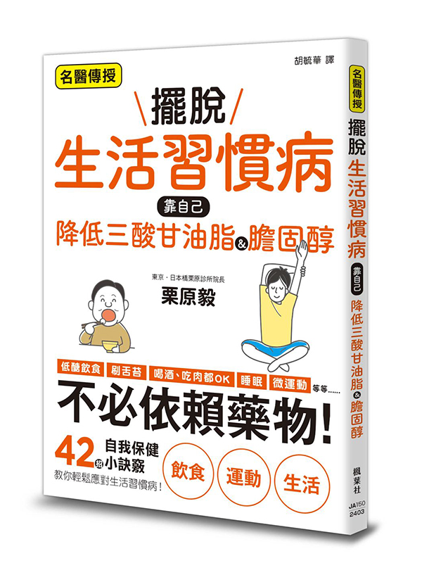 擺脫生活習慣病 靠自己降低三酸甘油脂&膽固醇 內容簡介 ∼遠離生活習慣病的自救寶典∼ 不必依賴藥物,從飲食、運動到生活習慣, 全方面打造健康人生! 【本書特色】 ◎豐富解說搭配圖示說明,簡單易懂、提升降脂效率! ◎「飲食」&「運動」&「生活」42招自我保健小訣竅,教你輕鬆應對生活習慣病! ◎由東京.日本橋栗原診所院長──栗原毅,撰寫最新、最專業的保健資訊! 相信大家都聽過「三酸甘油脂」及「膽固醇」, 但肯定很多人對這兩個名詞有錯誤認識! 大部分的人都認為,膽固醇或三酸甘油脂過高是因為飲食太過油膩。 然而,造成三酸甘油脂增加、體內囤積過多脂肪的元凶, 其實是【碳水化合物(=醣類)】! 因此,避免過量攝取米飯、甜食等碳水化合物及糖分高的水果, 才是控制三酸甘油脂的不二法門! 雖說膽固醇或三酸甘油脂過高不能算是生病,但其實離生病也只有一步之遙。 本書旨在幫助各位不要單純依賴藥物, 而是靠著日常運動、改善飲食及生活習慣等等, 以自己的力量來輔助降低膽固醇及三酸甘油脂。 第1章➤➤三酸甘油脂、膽固醇究竟是什麼? 身體在進行各種活動、工作等各種情況下,都會燃燒三酸甘油脂,將其轉換成身體所需的能量。 除此之外,三酸甘油脂也會形成皮下脂肪,發揮出禦寒保暖及降低外力衝擊的作用。 三酸甘油脂對於身體而言有著舉足輕重的地位,但過高就會對身體造成各種危害。 第2章➤➤降低三酸甘油脂的飲食妙招 降低三酸甘油脂的祕訣不是忍耐而是習慣! 「不忍耐微控醣飲食法」的重點,就在於習慣選擇不會讓飯後血糖飆高的食物。 養成吃飯時先吃蔬菜、細嚼慢嚥、主食最後吃、只吃八分飽、飯後運動等習慣,效果將更好。 第3章➤➤快速降低三酸甘油脂的口腔保健妙招 近來有報告指出,牙周病與脂肪過多及糖尿病也有密切的關聯。 三酸甘油脂過高並罹患脂肪肝的人,得到牙周病的比例大約是正常人的4倍。 也有研究報告指出,脂肪肝患者在治療牙周病以後,肝功能也有大幅度的改善。 (※因應印刷需要,內頁實際印刷的顏色會與預覽有所差異。※)