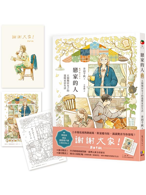 戀家的人︰五個獨居女子的溫暖家居生活【暢銷破萬慶功版】 內容簡介 ★連俞涵(演員)、末羊子(YouTuber)、蘇予昕(諮商心理師)──分享推薦 ★日本Amazon 800則五星好評推薦,上市後迅速熱銷10萬冊! ★溫暖、療癒、驚喜不斷,畫出那個或許也屬於你的,小小空間! ★構圖豐富有層次,房間格局布置考究,每一頁畫面都像百寶箱,承載了溫暖與幸福 人應該對自己更好一點。讀完本書,我發現家才是最親近、最寬闊且無限的奇幻仙境。――原田比香(暢銷書《三千圓的用法》作者) 我想創作一部作品,既讓人嚮往,又讓讀者想到自己時,發現「我的生活也很美好」!――井田千秋 人生是由無數個平凡的日子交織而成的, 而家,串起這些日子的開始與結束,忠實呈現了居住者的樣貌與個性, 家中每一個物件都藏著回憶與情感,是世界上最平凡但也最令人安心的地方。 以五位獨居女子的家為主題,從吃的食物、用的雜貨、生活的空間、嗜好與習慣……用細膩的觀察與筆觸,刻劃出五個不同類型女孩的個性,架構出五種家的樣貌。她們作息與個性迥異,但都深愛著自己的小窩,在家裡工作、待客、休閒、做菜、放空……做著喜歡的事,享受身在其中的時光,簡單療癒地度過每一天。她們深深喜愛自己的家,也喜愛著住在裡面的自己。 吳爾芙說過,女人要有自己的房間。作者細緻地以圖畫呈現了五個獨居女子在自己的房間裡度過的美好時光,是這些充分獲得滿足的日常,修復了在外打拚的疲憊,讓每一日都能煥然一新,重新出發。 本書特色 ★博客來選書.生活風格類No.1、誠品休閒趣味類No.1、金石堂翻譯文學類No.3、Readmoo生活風格類No.1──好評不斷熱賣中 ★上市後迅速熱銷破萬,限量慶功版,滿滿驚喜等你發現! ◇慶功驚喜1︰作者應邀親繪賀圖,臺灣元素全彩扉頁 ◇慶功驚喜2︰精美小海報2幅(彩稿收藏+線稿著色,擁有專屬於你的戀家生活)(一套二張,尺寸W13.8xH19cm) 上千讀者熱烈推薦 ★ 一本在書店翻閱絕對無法滿足的書,我買回家一口氣又讀了三遍! ★ 看完書,一整天的疲累就這樣消失了。好希望作者再做一本著色版! ★ 奈奈子的房間就是我的夢想!從今天開始一點一點學著完成自己最喜歡的房間! ★ 在繁忙疲憊的生活中,這本書給了我支撐下去的力量! ★ 不管讀多少遍都覺得很有趣。我把它放在沙發旁邊,方便隨時閱讀。 ★ 這是一本你可以不假思索地發呆、大笑、被治癒的書。 ★ 我一直跟家人同住,透過這本書,就好像正在體驗每個主角的生活一樣。 ★ 這是一本適合在睡前或下雨天讀的書,您會充分被療癒並愛上自己的房間。 ★ 當我累了、身體不舒服的時候,我只要翻閱書頁,溫柔的畫面就能撫慰我的心。 ★ 作為一個喜歡整理與布置房間的人,這是一本讓我想隨身攜帶的書。