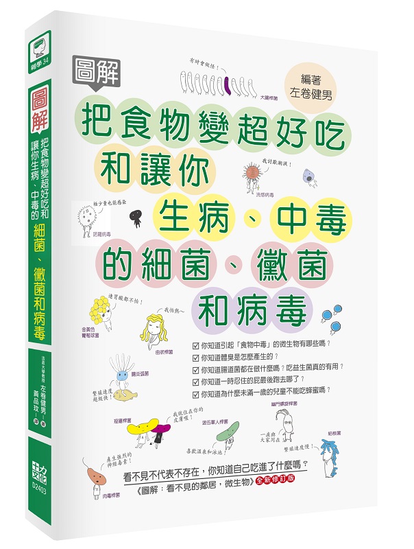 致各位讀者│006 本書登場的主要微生物│014 Chapter 1「微生物」是什麼生物? 01 我們身邊有哪些微生物?│022 02 黴菌、酵母和菇類的不同之處?│026 03 病毒是「生物」還是「無生物」?│029 04 發現微生物的是平民百姓?│032 05 什麼是生物的祖先「真核生物」、「原核生物」?│034 06 人類和微生物正在共生嗎?│037 07 生命是如何誕生的?│040 Chapter 2和人類一起生活的「常駐菌」 08 我們體內的「常駐菌」是什麼?│044 09 未滿1歲的嬰兒為什麼不可以吃蜂蜜?│046 10 為什麼會長青春痘?│048 11 為什麼會發臭?體臭如何產生的?│050 12 清潔得太乾淨,對美容無益?│054 13 抗菌產品真的對身體有益嗎?│057 14 蛀牙和牙周病會成為重大疾病的根源?│061 15 什麼是腸道菌群?│064 16 印象中對健康有益的乳酸菌和雙歧桿菌是什麼?│068 17 腸道菌都在做什麼?│071 18 忍住的屁都跑哪裡去了?│074 19 可以從糞便的顏色和形狀來檢查健康狀況嗎?│079 Chapter 3會製造「好吃食品」的微生物 20「發酵」和「腐敗」有什麼不同?│086 21 日本清酒的製法和啤酒、紅酒有什麼不同? │088 22 黴菌和釀造美味的味噌有什麼關係?│091 23 淡口醬油的鹽分濃度最高?│094 24 麵包和鬆餅有什麼不同?│097 25 啤酒的氣泡是微生物在吐氣嗎?│100 26 葡萄酒是怎麼釀造的?│102 27 從甜點到尖端技術都能做出醋酸菌?│104 28 柴魚乾醞釀出的香味多虧了微生物?│106 29 優格為什麼會有酸味和黏性?│108 30 發酵奶油並不是讓奶油發酵?│110 31 市面上各式各樣的起司有什麼不同?│112 32 醃菜是保存蔬菜的智慧?│115 33 美味的泡菜是乳酸菌醃製的嗎?│118 34 納豆的味道和黏性怎麼來的?│120 35 日本人發現的「鮮味」是什麼味?│122 Chapter 4 作為「分解者」的微生物 36 堆肥和微生物有什麼關係?│126 37 汙水處理和微生物有什麼關係?│130 38 自來水和微生物有什麼關係?│133 39 基因重組和微生物有什麼關係?│136 40 微生物可以分解的塑膠是什麼?│139 41 抗生素是什麼?│141 Chapter 5 引起「食物中毒」的微生物 42「食物中毒」是什麼?│146 43 直接捏飯糰很危險?《金黃色葡萄球菌》│148 44 自然界中最強的毒素?《肉毒桿菌》│151 45 為什麼日本以外的國家不喜歡生吃海鮮?《腸炎弧菌》│153 46 為什麼日本人能生吃雞蛋?《沙門氏菌》│156 47 為什麼雞肉一定要煮熟?《曲狀桿菌》│160 48 不清楚感染途徑?《病原性大腸桿菌》│163 49 酒精消毒沒有用?《諾羅病毒》│166 50 病毒性腸炎是症狀最嚴重的腸炎?《輪狀病毒》│169 51「新鮮的食品」也會感染嗎?《A型、E型肝炎病毒》│171 52 自來水會成為食物中毒的原因?《隱孢子蟲病》│173 53 從肉眼或味道無法判斷?《貝類中毒、雪卡毒魚類中毒》│175 54 能產生天然且最毒的致癌物?《黴菌毒素》│178 Chapter 6 引起「疾病」的微生物 55 兩者的不同之處?《感冒和流行性感冒》│182 56 現在全球每年還有數百萬人因此死亡?《結核菌》│186 57 證明了DNA基因說?《肺炎球菌》│190 58 孕婦感染就會生下畸形兒?《德國麻疹病毒》│194 59 中世紀時,導致歐洲約三成人口死亡? 《鼠疫桿菌》│196 60 甚至會影響人類的進化?《瘧原蟲》│198 61 空調有時也是致死的原因?《退伍軍人桿菌》│201 62 藉由藥物治療,可能長時間存活?《人類免疫缺乏病毒》│205 63 防止垂直感染使得帶原者快速減少?《B型肝炎病毒》│209 64 全球約有一半的人口感染?《幽門螺旋桿菌》│211 65 同樣的病毒會引發不同疾病?《帶狀皰疹病毒》│213 66 人類和動物會共通感染?《包蟲、狂犬病毒》│215 執筆者│219