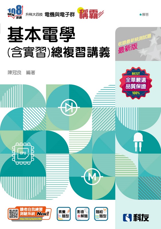 "第1章 電學概論 重點1:單位系統與科學符號 重點2:原子結構與性質 重點3:電子軌道 重點4:物質的電性 重點5:電荷 重點6:電流 重點7:電流的速率 重點8:電壓 重點9:電功率 重點10:電能與電度 重點11:效率 精選試題 歷屆試題 第2章 電阻 重點1:電阻 重點2:密爾(mil)與圓密爾(C.M) 重點3:電導 重點4:歐姆定理 重點5:色碼電阻 重點6:電阻溫度係數 重點7:焦耳定理 精選試題 歷屆試題 第3章 串並聯電路 重點1:電阻串聯電路 重點2:電阻並聯電路 重點3:並聯電阻計算方式 重點4:電阻串並聯電路 重點5:電壓源與電流源 重點6:電壓源與電流源互換定則 重點7:克希荷夫電壓定則(KVL) 重點8:克希荷夫電流定則(KCL) 重點9:Y-△電路互換 重點10:惠斯登電橋 重點11:電壓表與電流表應用 精選試題 歷屆試題 第4章 直流網路分析 重點1:節點電壓法 重點2:迴路電流法 重點3:重疊定理 重點4:戴維寧定理 重點5:諾頓定理 重點6:戴維寧與諾頓等效電路之轉換 重點7:最大功率轉移定理 重點8:密爾門定理 重點9:公共排法(Bus-Bar) 精選試題 歷屆試題 第5章 電容與靜電 重點1:電容器 重點2:電容量 重點3:電容器串並聯電路 重點4:電容器Y-△轉換 重點5:電容器的能量 重點6:電容平均充電 重點7:庫侖靜電定律 重點8:電場強度 重點9:電位 重點10:金屬球的電場強度與電位 重點11:電力線 重點12:電通和電通密度 重點13:高斯定理 重點14:介質強度(電位梯度) 精選試題 歷屆試題 第6章 電感與電磁 重點1:庫侖磁力定律 重點2:磁場強度 重點3:磁力線 重點4:磁通與磁通密度 重點5:磁阻與磁動勢 重點6:安培右手定則 重點7:佛來銘左手定則 重點8:佛來銘右手定則 重點9:法拉第定律與楞次定律 重點10:電感器的自感量 重點11:電感器的互感量 重點12:電感器的串並聯電路 重點13:電感器的儲能 精選試題 歷屆試題 第7章 直流暫態 重點1:初態和穩態 重點2:暫態方程式 重點3:RC暫態電路 重點4:RL暫態電路 精選試題 歷屆試題 第8章 交流電 重點1:電力系統概念 重點2:直流與交流 重點3:週期與頻率 重點4:角速度 重點5:交流一般式 重點6:相位 重點7:平均值 重點8:有效值 重點9:波峰因素與波形因素 重點10:向量運算 精選試題 歷屆試題 第9章 基本交流電路 重點1:純電阻電路 重點2:純電感電路 重點3:純電容電路 重點4:RL串聯電路 重點5:RC串聯電路 重點6:RLC串聯電路 重點7:RL並聯電路 重點8:RC並聯電路 重點9:RLC並聯電路 重點10:串聯電路與並聯電路互換 重點11:RLC串並聯電路 精選試題 歷屆試題 第10章 交流電功率 重點1:瞬時功率 重點2:平均功率 重點3:虛功率 重點4:視在功率 重點5:功率因數 重點6:功率因數的改善 精選試題 歷屆試題 第11章 諧振電路 重點1:串聯諧振電路 重點2:並聯諧振電路 重點3:串並聯諧振電路 精選試題 歷屆試題 第12章 交流電源 重點1:單相二線制與單相三線制 重點2:三相電源與相序 重點3:三相電路 重點4:三相平衡電路之連接 重點5:三相功率的量測 精選試題 歷屆試題 第13章 基本電學實習 重點1:工業安全和衛生 重點2:用電安全 重點3:急救處理 重點4:消防安全 重點5:麵包板 重點6:低功率電烙鐵 重點7:指針式三用電表 重點8:數位三用電表 重點9:電源供應器 重點10:電感器及電容器識別與量測 重點11:LCR 表 重點12:信號產生器 重點13:示波器 重點14:照明類器具之認識、安裝及檢修 重點15:電熱類之認識及檢修 重點16:旋轉類器具之認識及檢修 精選試題 歷屆試題 附錄 最新統測試題與解析 "