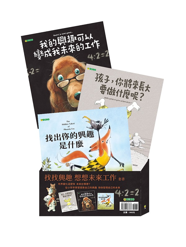 找找興趣 想想未來工作套書(共三冊) 內容簡介 世界變化這麼快 未來在哪裡? 從小早早學習探索自己的興趣 快快發現自己的未來 套書內容包含—— 《孩子,你將來長大要做什麼呢?》 《找出你的興趣是什麼》 《我的興趣可以變成我未來的工作》 《孩子,你將來長大要做什麼呢?》 孩子有機會表達他真正的喜好 才能發掘自己真正的興趣 爸爸是個天文學家,他覺得將來女兒也會跟他一樣。 媽媽是個明星演員,她覺得將來女兒也會跟她一樣。 爺爺是個芭蕾舞者、奶奶是個糕點廚師, 他們也都覺得小孫女會跟自己做一樣的工作。 這麼多人的意見,小女孩該如何取捨? 未來的工作誰決定? 《找出你的興趣是什麼》 到底要怎麼樣才能找出自己的興趣呢? 狐狸菲尼克斯和大部份的孩子一樣, 他不知道自己的興趣是什麼?最擅長的是什麼? 他想學別人擅長的事,但是,怎麼也做不好,很沮喪。 想了又想,試了又試…… 狐狸菲尼克斯是怎麼找到他的興趣的? 你也好奇了吧! 《我的興趣可以變成我未來的工作》 第41次中小學生優良課外讀物推介 109年度「兒童閱讀優良媒材評選」 喜歡發號施令讓大家能遵守規則的安東尼, 長大以後想當警察! 聽到音樂,就會忍不住手舞足蹈的蘿拉, 長大以後想當舞者! 在沙坑裡能堆出最高的沙堡的海倫, 長大以後想當建築師! 夢想的生成, 可能從一件自己喜歡與擅長的小事萌芽。