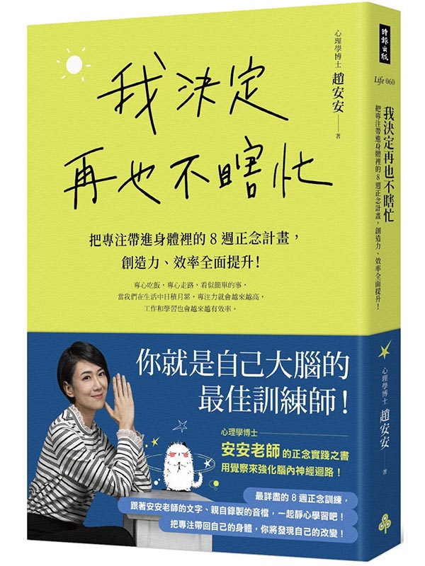 我決定再也不瞎忙:把專注帶進身體裡的8週正念計畫,創造力、效率全面提升! 內容簡介 你就是自己大腦的最佳訓練師! 用「正念X腦科學」重塑大腦, 掙脫忙碌的現代生活,找回專注與安定。 心理學博士──安安老師的正念實踐之書, 用覺察來強化腦內神經迴路! 最詳盡的8週正念訓練, 跟著安安老師的文字、親自錄製的音檔,一起靜心學習吧! 把專注帶回自己的身體,你將發現自己的改變! 【關於本書】 「每天都好忙,時間永遠不夠用,但我到底在忙什麼?」 在資訊爆炸、高速運轉的現代社會中,許多人都陷入「瞎忙症候群」,每天像顆陀螺高速運轉,越忙效率越低,甚至不知如何排解壓力,把情緒發洩在無辜的人身上。心理學博士安安老師告訴我們,只要真切地活在當下,時間就會變多,心靈也能更從容! 「正念」是對當下的專注與覺察,能幫助心智跳脫忙、盲、茫模式。本書系統性地規劃八週正念課程,從最基本的呼吸練習開始,帶領讀者覺察和接納自己的身體、情緒、想法與環境。一步一步地認識正念、練習正念,並應用在生活的每一刻。 練習正念後,你會發現專注力大幅提高,可花更少時間完成事情,不只提高了工作效率,也對自己的情緒狀態更敏銳,即使有負面情緒也不抗拒、不執著,能慢慢把它轉化成正面力量。 從現在開始練習,擺脫瞎忙,找回內心的安定! 【8週課程,讓正念進入你的生活】 Lesson 1:從呼吸開始覺察自己。 Lesson 2:練習正念常見的五種障礙,如何擺脫? Lesson 3:接受生命中一切的變化,學習「默照」的功夫。 Lesson 4:不被情緒綁架,讓情緒來去不執著。 Lesson 5:心念是自己創造的幻覺,看見腦袋裡的念頭。 Lesson 6:放下與接納,開始與煩惱和平共處。 Lesson 7:從做自己最好的朋友開始,用正念處理人際關係。 Lesson 8:跳脫舊有的思考慣性,為美好人生準備能量。