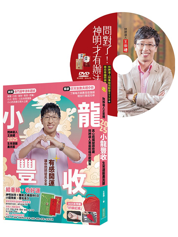 2025小龍豐收+與神溝通術超值套組:《2025問神達人王崇禮小龍豐收生肖運籤農民曆》+《一看就懂!拜拜都需要的與神溝通術》 商品簡介 神明運勢叮嚀,2025的順境逆境都暢通; 看影片學會與神溝通,人生交叉點不用怕! -隨書贈品- ★好緣紅線+錢母存摺套+添貴人靈符+防小人盜賊祝融靈符★ 《2025問神達人王崇禮小龍豐收生肖運籤農民曆》 ◆2025年特贈「好緣紅線」:特別祈請月老星君加持「好緣紅線」,助人緣、牽姻緣 ◆神明加持禮!招財防漏、招貴人防小人:「富蛇」招財防漏發金存摺套+雙符護佑 ◆問神達人專屬祝福印刷親簽:2025年王崇禮老師好緣祝福,祕語收藏 ◆獨家60干支生肖「宗天氣數」分析:了解每月氣數高低強弱,增加行事成功率 ◆親算奇門遁甲流年避凶:分別為每個生肖親算2025年可能出現的車關、口舌、破財、衝突、詐騙、官司、小人、小三等關限日期,在這些日子請儘可能小心謹慎 ◆12生肖小龍年運籤解析:60甲子籤詩+雷雨師100籤,秒懂7大運勢吉凶進退 ◆拜拜開運祈福示範:送神╱除夕╱初一求神╱安太歲╱開工╱掃墓╱端午╱普渡╱重陽,拜對求對了,神、靈、人平安一整年 2025年迎來乙巳青蛇年,蛇年又稱「小龍年」。蛇在傳統上被視為智慧與神祕的象徵,人們認為牠能掌握隱祕的知識和力量;蛇也與財富和繁榮有關,古人相信蛇能帶來好運和財富;因此,蛇年往往被視為充滿智慧、變革、機會與財運亨通的一年。另一方面,蛇也與謹慎、冷靜有關,提醒我們行事謹慎、切勿貪婪──《2025問神達人小龍豐收生肖運籤農民曆》陪你應對蛇年可能的變化,讓你運勢旺旺、感情美滿、財運亨通、收獲滿滿! ★神明加持好緣紅線+發財金存摺套+雙靈符,神力護佑,招財、保平安、好人緣 為了護佑讀者在小龍年財運大發、貴人相助、順利安康,王崇禮老師祈請神明加持招財防漏發財金存摺套,以及添貴人相助靈符、防小人盜賊祝融靈符,此次更特請月老星君賜福加持「好緣紅線」,大家收到後可以戴在手上,也可以放在隨身包、錢包內,或是放在枕頭下,希望能為讀者在新的一年招來好人緣、好姻緣,或是改善人際關係。 【好緣紅線,1條】幫助提升人緣、牽姻緣,可以綁手上,也可以放在皮夾、包包隨身攜帶(好緣紅線裝在紅色紙袋中,可以直接連著紙袋收在錢包或包包暗袋中,比較不擔心弄丟、找不到)。 【引錢發財金,1枚】發財金放在2025年的新存摺套裡,利用發財金錢母鎮守,把錢財引進來。 【防漏財存摺套,1個】印有神符及五路財神送財符,除了幫你把錢賺進來,還要助你守住財。 【添貴人相助靈符,1張】祈求工作貴人來提攜、財富貴人迎富貴、姻緣貴人招桃花。 【防小人盜賊祝融靈符,1張】預防因為小人、盜賊、祝融而起的事業、財運、健康、學業、感情不順,除了隨身攜帶,最合適貼於居家、公司、店鋪的大門外,建議貼在門口春聯的空白處,低調防小人、防盜賊、防祝融。 ★獨家「60干支生肖12個月宗天氣數分析」,精準掌握進退時機,提升成功率 小龍年特別新增獨一無二的「60干支生肖12個月宗天氣數具體分析」,獨家公開不同生肖在乙巳年每個月的氣數。 王崇禮老師這次特別為讀者親算每個生肖的氣數強弱高低,運籤代表的是一個生肖的平均整體狀況,但同一生肖不同年分出生,例如屬鼠的人就分甲子鼠、丙子鼠、戊子鼠、庚子鼠和壬子鼠,他們的運勢和氣數不會完全相同,而「宗天氣數具體分析」將能「更精準」地讓不同年分的不同生肖,各自知道自己每個月該進或該退,該衝刺或該保守與觀望。 ★2025「專屬祝福」,問神達人特別題字與每一位購書讀者「結好緣」 為替大家在新的一年裡注入不一樣的能量,王崇禮老師提筆為大家寫下小龍年的祝福語──「良緣隨身 善緣滿滿」,希望大家在乙巳小龍年裡,不論是與家人、朋友、同事、同學、另一半、甚至是萍水相逢之人等等,都能豐收友善、融洽或美好的關係! ★上、下半年「7大運勢」籤詩,神明叮嚀吉凶關鍵,帶你趨福避禍 運勢不會永遠處於巔峰,也不會一直低迷,但要在一年的起伏中趨吉避凶,除了智慧與正確心態,神明慈賜運籤,問神達人精準解籤,傳授你我小龍年的處事原則、吉凶關鍵,輔助12生肖事業、感情、荷包、學業、健康、求子7大運勢平安、豐收! ★問神達人親算「奇門遁甲」,提醒12生肖避開流年凶險,保命護身 12生肖運籤詩主要是「宏觀大方向」,王崇禮老師還親自運用「奇門遁甲」排盤,指點運勢中的「微觀細節」,為「每一個生肖」算出2025年需留意小心的事件及日期,收錄在每個生肖運籤解析之後,讓讀者盡可能避開可能會發生的車關風險、口舌紛爭、破財危機、肢體衝突、小人詐騙、官司困境或職場小人等不必要的麻煩──在這些特別點出的時間點裡,請大家盡可能謹慎行事。 ★吉日速查求好開始;拜拜祈福儀式不藏私示範,整年都平安 跳脫傳統農民曆深奧的內容,以淺顯易懂的方式為大家精選日常生活中,動土、安床、訂盟、納采、完聘、豎招牌、掛匾、神佛開光點眼、移徙、入宅、安香、買車交車等所需要的好日子,更有補運解厄訣竅、開春求貴人、求財運、求學業和升遷、開工等祈福儀式的吉時和簡單做法。 問神達人問事祕技影音光碟(原《問對了!神明才有辦法幫你》DVD) ★神明加持,高雄梓官城隍爺與問神達人合作辦案、濟世救人 ★完整收錄,博杯+抽籤+解籤,