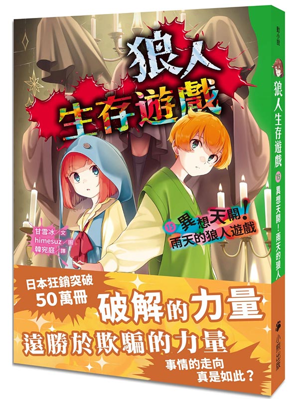 狼人生存遊戲15:異想天開!雨天的狼人遊戲 內容簡介 \日本狂銷突破50萬冊!/ ∼ 誠摯邀請 雨天的狼人遊戲 ∼ 新規則、新遊戲、新狼人……實在充滿無窮魅力, 希望各位連同伯爵的份盡情玩樂! 輝天鳥帶著祝福翩然降臨, 在奇幻迷離的遊戲中掀起滔天巨浪, 將有利戰局,還是故弄玄虛,擾亂方寸? 屋外滂沱大雨,不時夾雜著雨點打在遮雨棚上的滴答聲,天空被厚重的烏雲覆蓋,昏暗的光線彷彿夜晚提前到來。飯店內,點點燭光微弱閃爍,一場「無人退場」的生存遊戲即將開始! 參加者們一如既往,默默接過規則,但眼神卻紛紛集中在「追加規則」上,因為這項規則的設計者,正是參與過多次遊戲的元老──赤村隼。 破解的力量遠勝於欺騙的力量! 事情的走向真是如此? 在此規則之下,直到遊戲第三天的最高得票者退場前,因投票或被襲擊的參加者都不會立刻出局,而是能留在現場繼續參與討論,換句話說,在第三天的投票結果公布前,場上的人員都不會減少! 此項規則乍看之下對村人陣營有利,參加者之間能有更多的意見交流,順利的話,就能快速找出敵方破綻,揪出狼人,終結遊戲;然而,倘若這些留在場上的「視同退場者」屬狼人陣營,則能趁機作亂,誤導村人,進一步影響後續遊戲的走向…… 這些「視同退場者」的存在,究竟是福,還是禍? 【追加規則:輝天鳥的祝福】 〔規則1〕至遊戲第三天公布投票結果為止,參加者都不會「退場」,可以繼續留在遊戲舞臺。 〔規則2〕因投票或襲擊而「被視為退場」的參加者,在遊戲第三天公布投票結果之前,都可以繼續參與討論。 ※投票結果會以廣播通知,襲擊結果僅會以廣播通知是否成功。 ※通靈師可以對「被視為退場」的參加者使用能力。 ※「被視為退場」的參加者無法發動能力,投票也不列入計算。 ※違反禁止事項而退場者不包含在內。 〔規則3〕至遊戲第三天公布投票結果為止,即便已達到勝負條件,遊戲也不會結束。 〔規則4〕在遊戲第三天公布投票結果時,將一次對所有因投票或襲擊而退場者進行處置。 〔規則5〕在遊戲第三天公布投票結果之後,所有祝福將會失效。 在想要破解真相的那一刻, 你便踏入陷阱、無法抽離, 唯一能做的就是──拚盡全力爭取勝利! 登場人物 裁判 伯爵:擅長所有遊戲,強迫孩子們參加他所安排的狼人遊戲。 參加者 赤村隼:曾與青梅竹馬黑宮兔一起參加過許多次伯爵主辦的狼人遊戲,就讀椿之丘中學。 黑宮兔:赤村隼的青梅竹馬,就讀椿之丘中學,是個超級貪吃鬼。 銀條魚虎:擅長武藝的高䠷女孩,就讀椿之丘中學。 群青蝮:戴著蛇形耳環、身材微胖的男孩,就讀月影館中學。 墨坂鬥魚:身著華麗的佛朗明哥禮服,個性活潑外向,就讀月影館中學。 水山葵凱門:身材高䠷,戴著龐克造型的口罩,就讀月影館中學。 桔梗路蠶:戴著黑框眼鏡的女孩,為陽光館中學的學生會長。 莓屋獰貓:綁著頭巾的男孩,就讀陽光館中學。 ★「狼人生存遊戲」系列(更多續集陸續推出,敬請期待!) •《狼人生存遊戲1:無處可逃!伯爵的狼人遊戲》 •《狼人生存遊戲2:極限投票!守衛vs.狼人遊戲》 •《狼人生存遊戲3:絕望街區!存活率1%的狼人遊戲》 •《狼人生存遊戲4:一舉逆轉!IQ200的狼人遊戲》 •《狼人生存遊戲5:膽戰心驚!冰點下的狼人遊戲》 •《狼人生存遊戲6:頂尖對決!三方爭霸的狼人遊戲》 •《狼人生存遊戲7:神出鬼沒!一百億圓的狼人遊戲【上集】》 •《狼人生存遊戲8:神出鬼沒!一百億圓的狼人遊戲【下集】》 •《狼人生存遊戲9:電光石火!明欺暗騙的狼人遊戲》 •《狼人生存遊戲10:心有靈犀!無人島上的狼人遊戲》 •《狼人生存遊戲11:背水一戰!諸神召喚的狼人遊戲【上集】》 •《狼人生存遊戲12:背水一戰!諸神召喚的狼人遊戲【下集】》 •《狼人生存遊戲13:疑神疑鬼!水都的狼人遊戲》 •《狼人生存遊戲14:暗中摸索!小學校園的狼人遊戲》 •《狼人生存遊戲15:異想天開!雨天的狼人遊戲》 燒腦推薦 •Tey Cheng(【小學生都看什麼書】社團版主) •張美蘭/小熊媽(親職/繪本作家) •陳家盈(翻轉讀書繪文學工作坊負責人) •傅宓慧(桃園市龍星國小圖書館閱讀推動教師) •黃慧瑜/小魚老師(FB粉專【小魚老師的斜槓教室】版主) •鄒敦怜(兒童文學作家、龍傳文創顧問) •賴秋江(作家、國小教師) (依首字筆畫排序) 好評推薦 狼人遊戲(又稱「狼人殺」)想必大大小小都不陌生,這是一種以心理戰為主的鬥智型遊戲,建立在觀察、信任與機智、選擇之下;而作者巧妙的以懸疑和推理小說的高度去架構精采刺激的閱讀實境,將我們捲入一場場冒險的遊戲當中!也沒忘了在虛構的遊戲當中穿插真實的人性與善惡、智慧的議題。閱讀過程讓我們隨著狼人的神出鬼沒而膽戰心驚,再運用文字遊戲帶我們與角色燒腦交鋒,不到最後關頭絕對猜不到「狼人」的蹤跡!這是一套使人身歷其境並為之驚豔的小說,誠摯推薦!──陳家盈(翻轉讀書繪文學工作坊負責人) 這系列光是書名就令人心生畏懼,沒想到在可愛的插圖中,竟是驚悚又燒腦的狼人遊戲劇情,遊戲規則是要在限定的時間中,猜出狼人是誰,猜錯的話……後果不堪設想!呼叫膽子大的青少年讀者快來觀戰,一起加入這詭譎又刺激的故事,保證你看到最後,大呼過癮喔!──傅宓慧(桃園市龍星國小圖書館閱讀推動教師) 學生對班級要有向心力,最基本的就是要彼此信任、互助合作。而