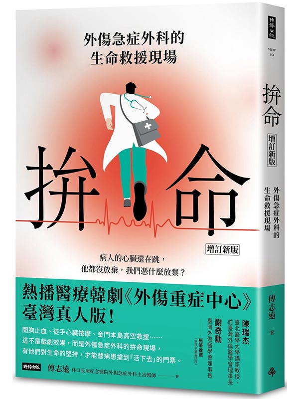 拚命:外傷急症外科的生命救援現場〔增訂新版〕 內容簡介 熱播醫療韓劇《外傷重症中心》 臺灣真人版! 開胸止血、徒手心臟按摩、金門本島高空救援…… 這不是戲劇效果,而是外傷急症外科的拚命現場, 有他們對生命的堅持,才能替病患搶到「活下去」的門票。 在離死亡最近的地方奮戰── 32 篇用手術刀寫下的生命故事 走入醫療現場,來到忙碌紛亂的外傷急症外科。 這裡是和死神搶奪生命的戰場── 因車禍而四分五裂的臟器,在最短的時間內切除止血;已經是一直線的心電圖,心臟卻在胸腔切開直接按壓下恢復了跳動。手術室一再上演生命的脆弱與堅韌,外科醫師的使命就是堅持到最後一刻,讓每個遭遇意外的人,能繼續自己的人生。 這裡也是人性的試煉場── 拚命搶救回來的生命卻成了植物人、重傷送醫的死刑犯該不該救?生命本該無價,但在金錢、地位、道德之前卻會被衡量。本書透過這些無解難題,帶領我們一窺人性掙扎與社會現實。 《拚命》是傅志遠醫師的第一本醫療散文,也是他的代表作之一,書中用多則真實的醫療故事,映照出生死之前不同的人性樣態。增訂新版不僅收錄全新篇章,更加入傅醫師十五年來在身分與心境轉變後的省思。即使時代變遷,醫療技術日新月異,醫護人員為病患拚命的初心,始終不變。 名人推薦 陳瑞杰 臺北醫學大學講座教授、前臺灣外傷醫學會理事長 謝奇勳 臺灣外傷醫學會理事長 ──振筆推薦 (依首字筆畫排序)