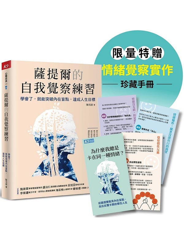 薩提爾的自我覺察練習(情緒覺察手冊限量版):學會了,就能突破內在盲點,達成人生目標 內容簡介 限量特贈《為什麼我總是卡在同一種情緒?》手冊 這不是一本書加一份手冊,而是一套讓你擺脫情緒卡關,「開始改變」的覺察工具。 為什麼努力溝通,卻總是反覆受傷? 真正想要的不是爭贏,而是被理解。 手冊對應九種日常情緒卡關:爆炸、後悔、玻璃心、衝突……, 覺察提醒 × 即刻練習, 幫助你——立刻釐清慣性反應與深層情緒 ——看見真正的渴望 ——練習具體表達期待 不再被情緒牽著走,疏通內心的結,從這裡開始找答案! *** 總有些問題讓我們反覆受挫,卻不明白原因。 一本將薩提爾理論應用在自我探索、發掘自身盲點的專書, 練習覺察,找出深埋的情緒、期待、價值盲點, 打破心理慣性,才是解決反覆困擾、達成心理期望的捷徑。 ・工作績效被豬隊友連累,雖然很想有話直說請對方改進,但一顧及團隊和諧怎麼也開不了口? ・為了關燈倒垃圾等小事常跟另一半大吵,雖然事後總覺得不值得吵,但不知為什麼,每次到了節骨眼卻控制不了自己? ・明明已經成年獨立,卻仍然無法違背父母的期望,總是勉強自己去追求那些自己不感興趣的目標? 我們總以為很了解自己,其實內心仍深埋許多不解的黑洞。我們每個人都有盲點。 應用薩提爾的理論,深度自我對話, 擺脫慣性的枷鎖,實現自在的人生! 心理治療大師維琴尼亞.薩提爾女士提出的「薩提爾模式」指出,現實人生的各種問題及困頓,都脫離不了要維持「自己、他人、情境」這三角關係的平衡。但我們通常一碰到難題,會不假思索一再重複做出失衡的慣性行為,例如迎合別人、委屈自己;或只顧自己,不管他人與事情……等等。 這樣的慣性行為是「不一致」的行為模式,是受到由我們的情緒、觀點、渴望、期待所涵蓋的內在冰山所驅使。唯有認識巨大的內在冰山,才能真正了解自己,改變自己,進而才可能改變別人。 本書作者陳茂雄是國內企業教練的先驅,也是資深的諮商心理師。他師承薩提爾女士的入室弟子學習薩提爾模式的理論與應用,從多年的諮商經驗歸納出實用工具,在這本書中直接聚焦薩提爾模式的最核心:自我覺察,引導我們去除內在盲點,與市面上將薩提爾模式運用在親子溝通、婚姻治療的面向,截然不同。 情境案例 × 分析工具 × 自我練習,一套具體、可學習、可操作的模式, 從認知到轉化,有系統地由內而外改變人生—— •第一步:找出自己的慣性模式 透過職場、家庭等情境案例的引導,帶你辨識出自己最常展現的行為慣性。 •第二步:解讀內在盲點 學會畫出內在冰山圖,解讀行為背後藏著哪些情緒、觀點、渴望、期待的盲點。 •第三步:轉化內在慣性 了解盲點之後,依照希望達成的目標,找出內心該有的新情緒、新觀點、新渴望、新期待,做出兼顧自己與他人感受、外在情境需求的行為。 不論你想更認識自己、了解自己,或是想改善人際關係、發揮更大的影響力,這本書都將滿足你! 好評推薦 施崇棠 華碩電腦董事長 盛治仁 雲朗觀光集團總經理 呂旭亞 榮格分析師 李崇建 親子作家、長耳兔心靈維度講師 海苔熊 心理學作家 鄭俊德 《閱讀人》主編 「認識自己絕非字面上看起來那麼容易的一件事。陳茂雄老師的著作正好提供了理論架構、分析方法和解決方案,讓我們不但能夠認識自己,還能透過思考和練習,改變先天的限制,成為一個更全面的人。」——雲朗觀光集團總經理 盛治仁 「茂雄在本書中,運用極大的巧思,呈現人如何覺察,並且改變自身慣性。」——親子作家、長耳兔心靈維度講師 李崇建 「我們是自己的地獄,但同時也是自己的救贖。當我們可以看透心中那座冰山,平衡自己、他人、還有情境三者之間的關係,嘗試用一致的方式,連結內在和外在的世界,那些原本困住我們的東西,就能夠柳暗花明。」——心理學作家 海苔熊 「其實每種人際關係的應對,如職場、親子、夫妻等,所要運用的技巧與智慧都不盡相同,但最初都是從認識自己開始,理解自己的慣性回應做法,再透過技巧訓練新的情緒表達,就能將人際難題迎刃而解,與大家分享這本幫助人生闖通關的好書。」——《閱讀人》主編 鄭俊德