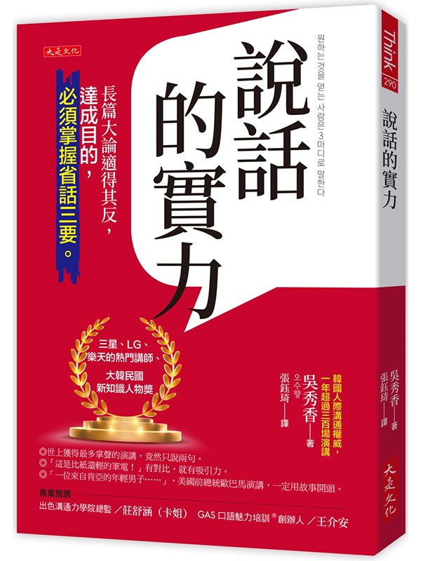 作者簡介 吳秀香 韓國權威也最炙手可熱的人際溝通專家。 白石大學終身教育、人力資源開發研究所結業,專注於研究教育心理與諮商心理學,現任SHO對話心理研究所所長。 她運用首創的「心理對話法」,幫助人們解決人際關係的困擾,並針對職場、夫妻和親子溝通提供諮商建議。曾在各大企業與政府機關舉辦了演講,一年超過三百場,並在韓國放送通信大學擔任演講導師,培育新一代說話專家。 此外,她也積極參與許多電視臺節目,更獲頒大韓民國新知識人物獎、大韓民國人力資源開發大獎、HRD名師獎、環境部長官獎、首爾市彩緞獎、國會文化藝術部門表彰獎等多項大獎。 譯者簡介 張鈺琦 中國文化大學中文系博士候選人,韓文系文學碩士,同時擔任韓文系兼任講師。曾任臺灣、日本及韓國雜誌的中文版總編輯。 著有《別笑,我是韓語學習書》、《跟著韓流總編玩釜山》等書。譯作遍及韓國醫美、美容、理財、學習、醫學等領域,目前以譯者、作家、教師和講者身分活躍。 臉書粉絲專頁:伊麗莎的趣味韓國、每天開心學韓語。
