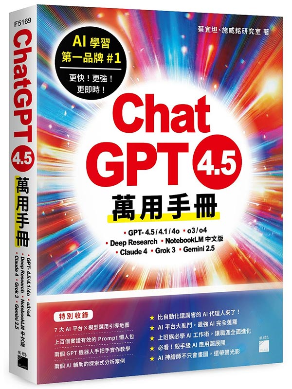 ChatGPT 4.5 萬用手冊:GPT-4.5/4.1/4o、o3/o4、Deep Research、NotebookLM 中文版、Claude 4、Grok 3、Gemini 2.5